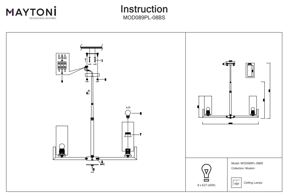 Вариант с 10 тела: диаметър – 86 см, височина – 54-76,4 см, височина на шапката – 10 см, основа – ∅ 12 х 2,5 см - Мощност: 6, 8 или 10 х 40W