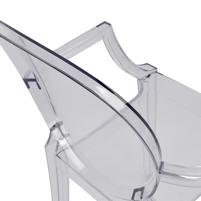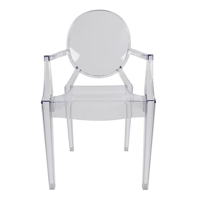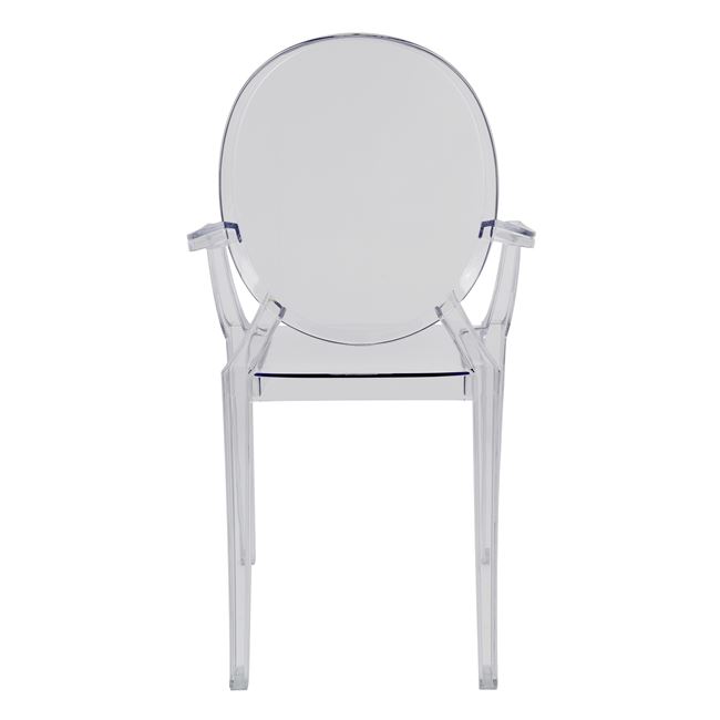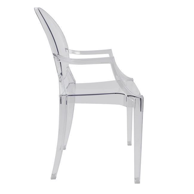 Модерен прозрачен стол с подлакътници за удобство и допълнителен комфорт и елегантна овална форма на облегалката. Изработен е от акрил.