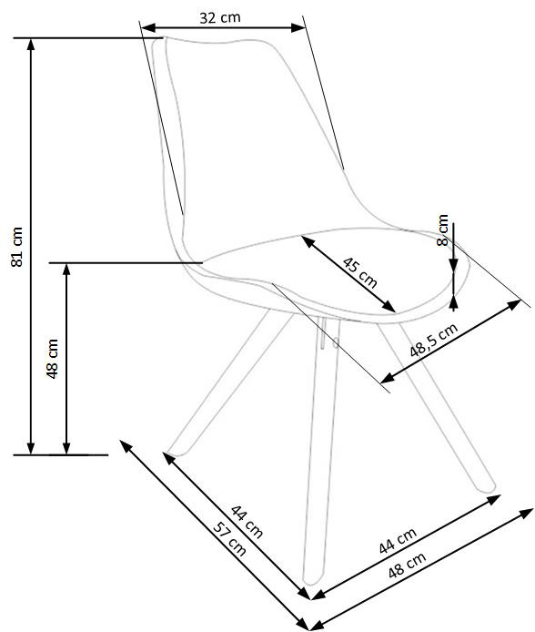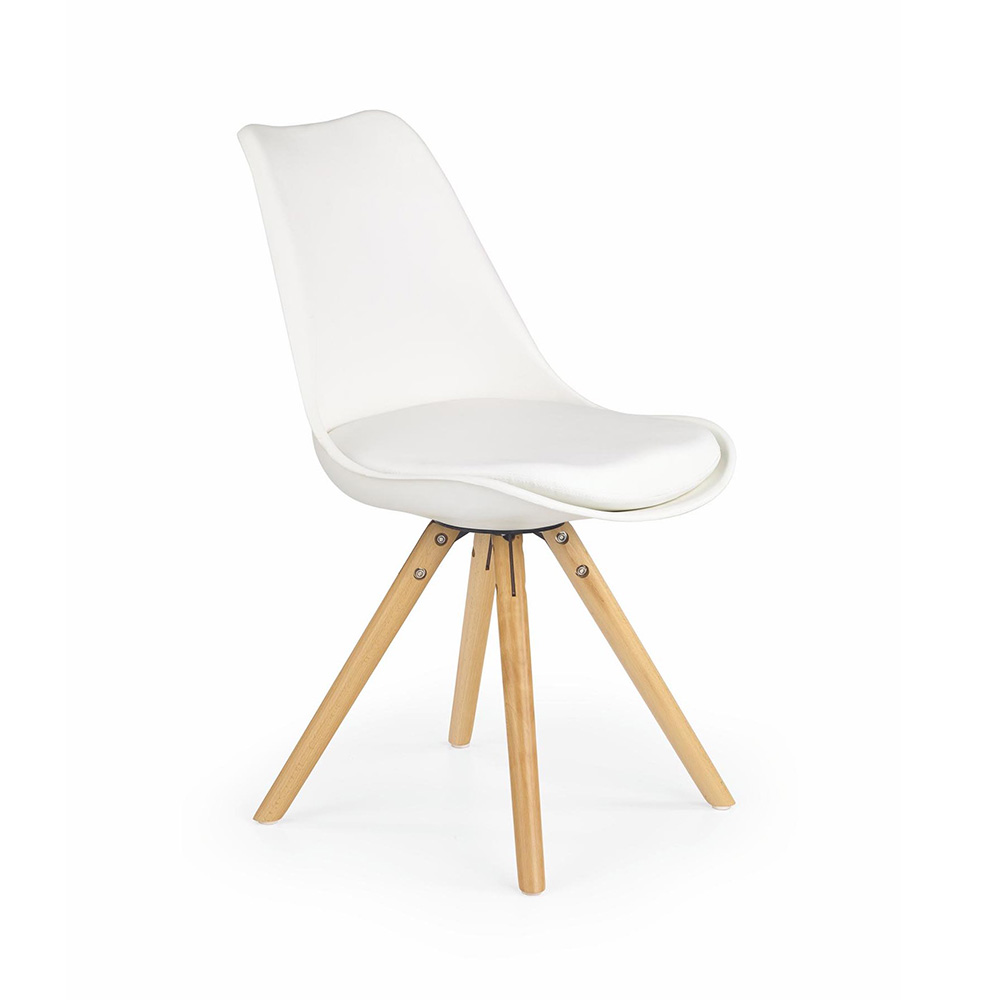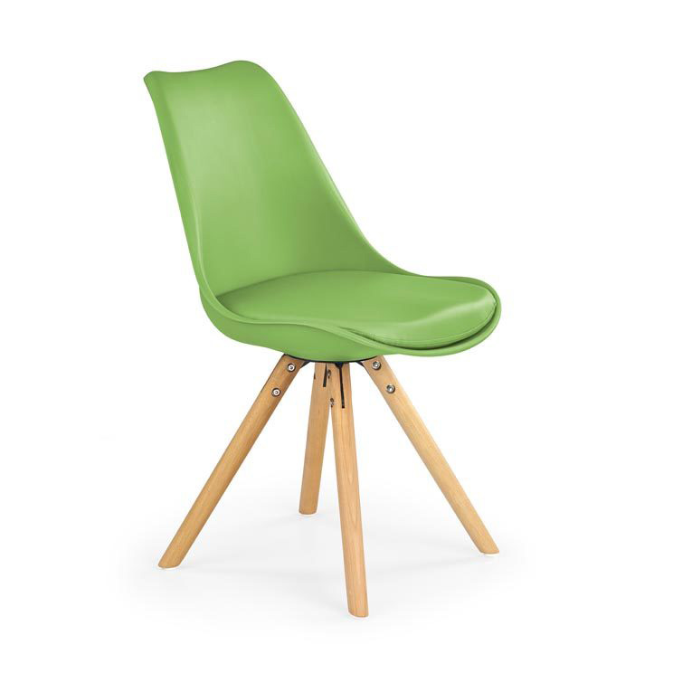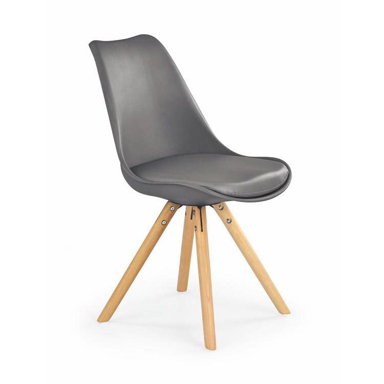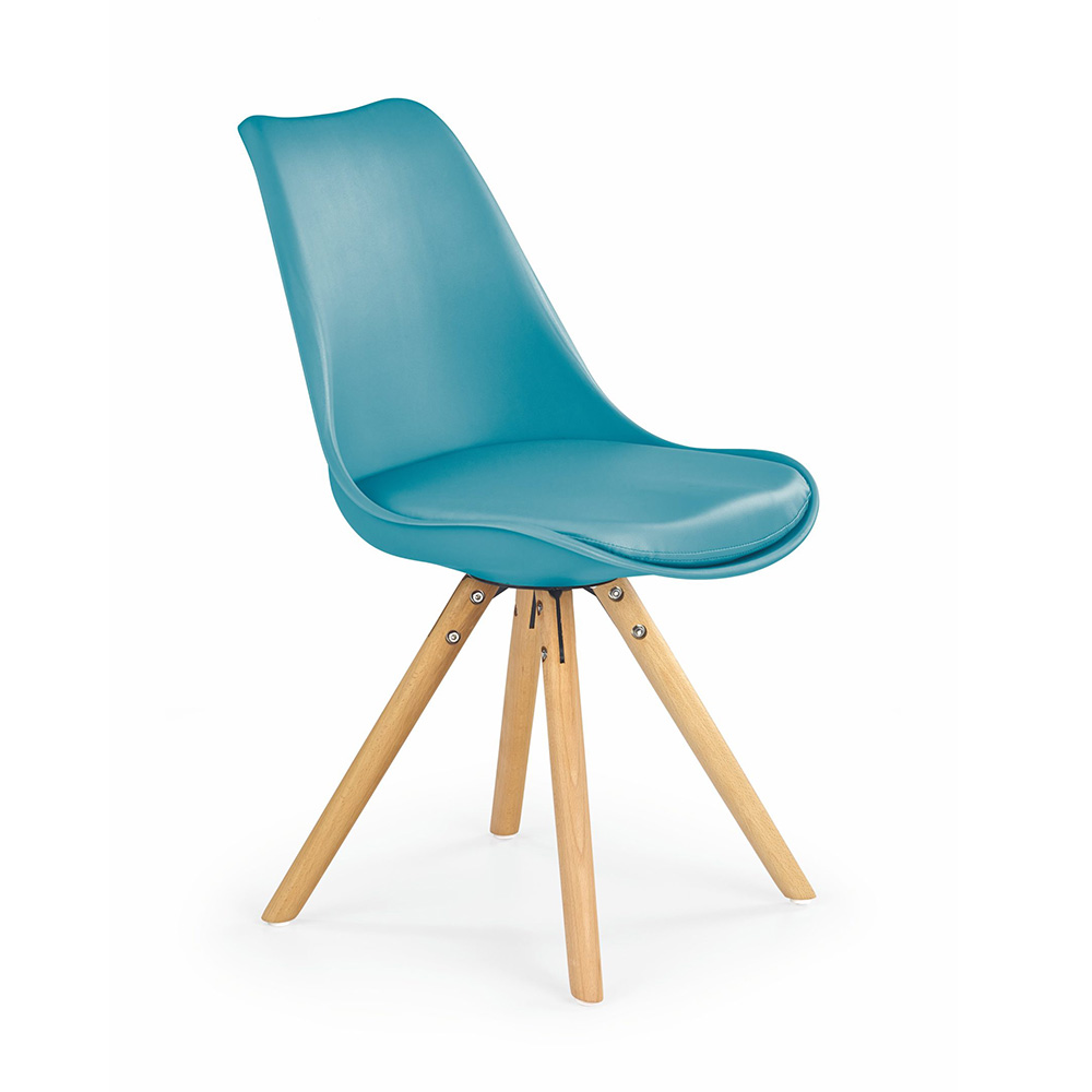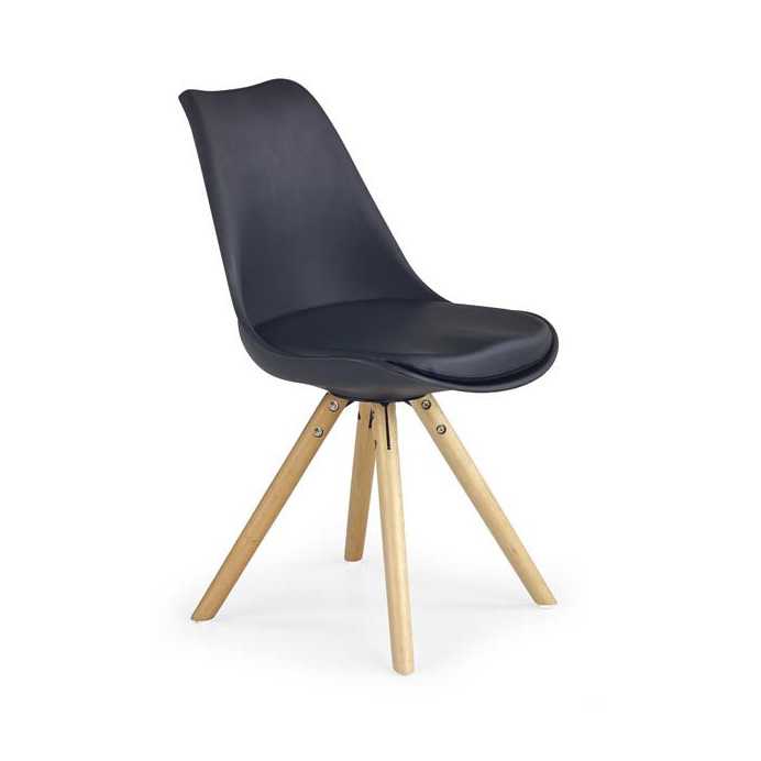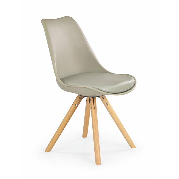 Модерен стол от пластмаса и еко кожа с дървени крака от бук, който би паснал на обзавеждането у дома, в офиса, в кафене, бар или ресторант.