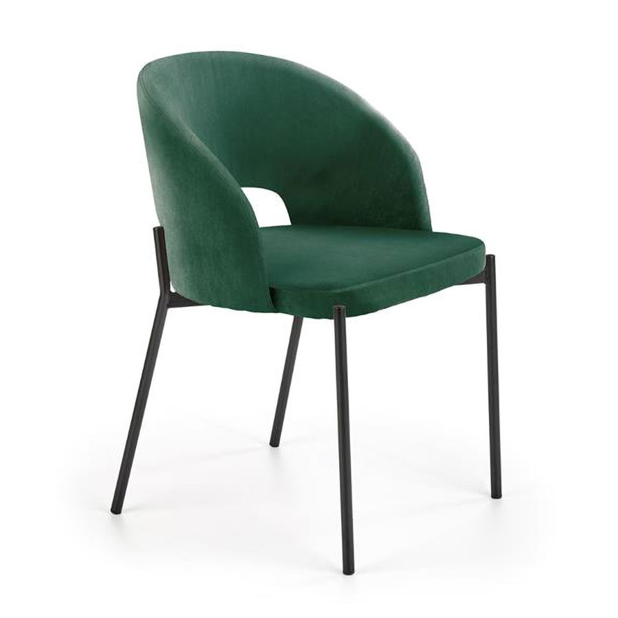 Модерен трапезен стол с тапицерия от кадифе, овална облегалка с изрязан детайл и черни крака от метал.