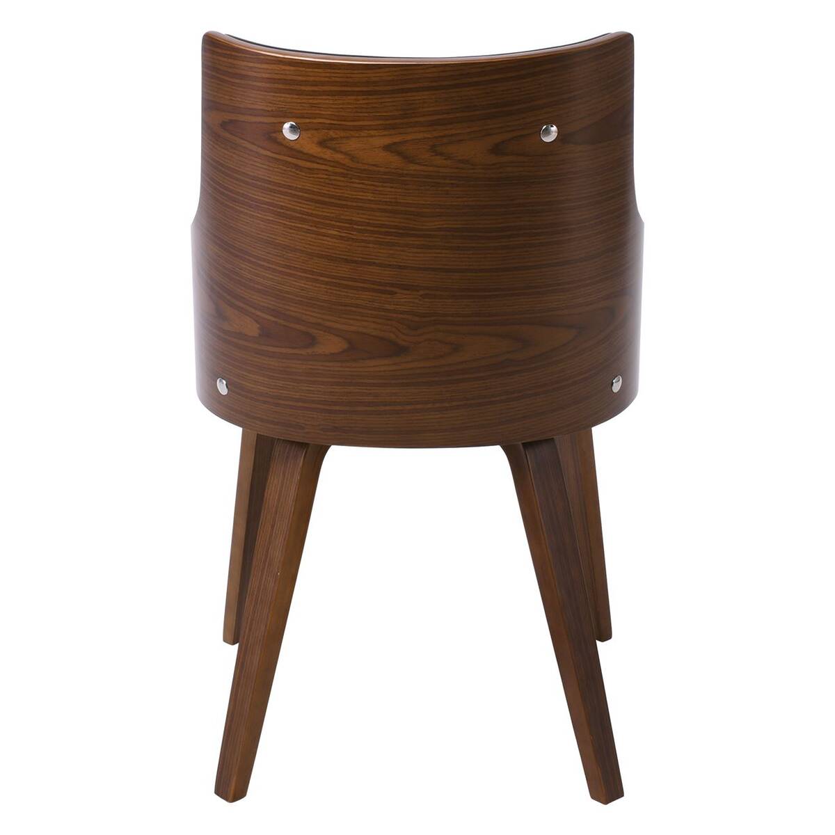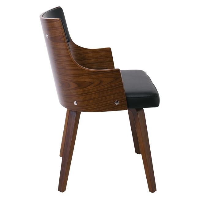 Модерният трапезен стол с извити подлакътници е изработен от конструкция от дърво в цвят орех и с тапицерия на седалката и облегалката от еко кожа в черен нюанс.