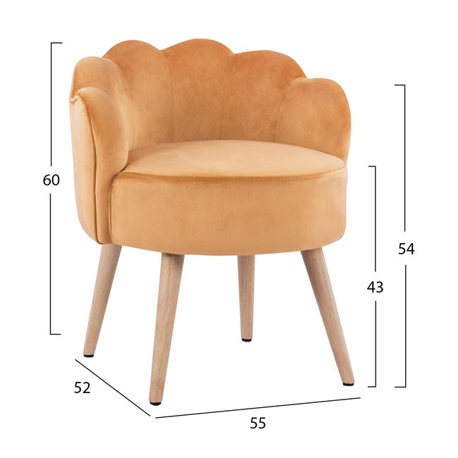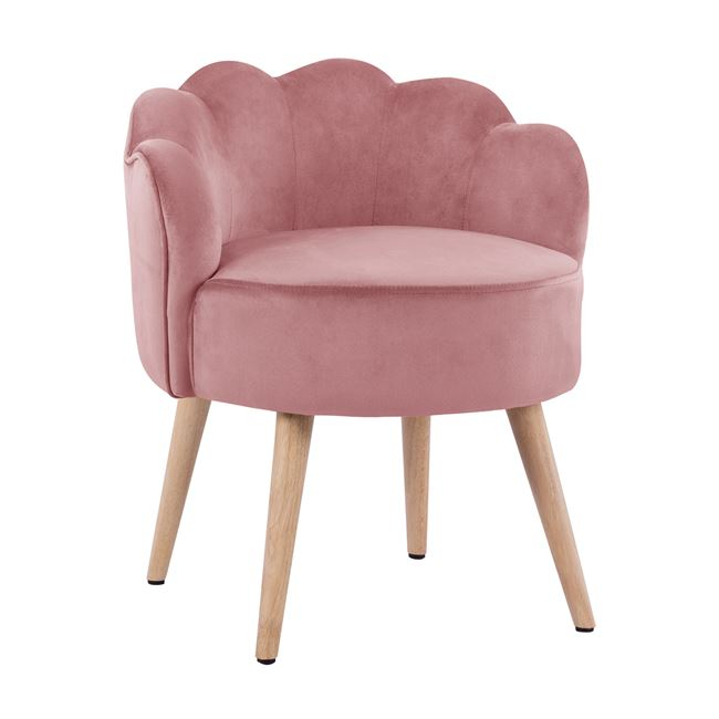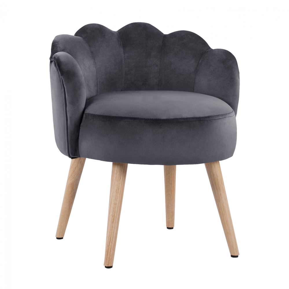 Модерна табуретка в дамаска от кадифе с нестандартна форма на облегалката, наподобяваща мида, кръгла мека седалка и четири дървени крачета в натурален цвят.