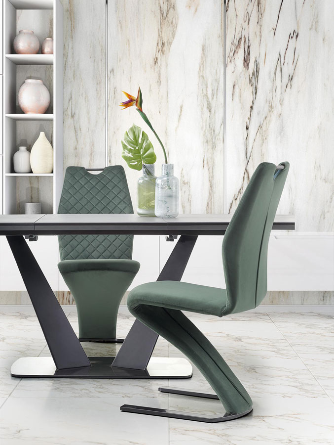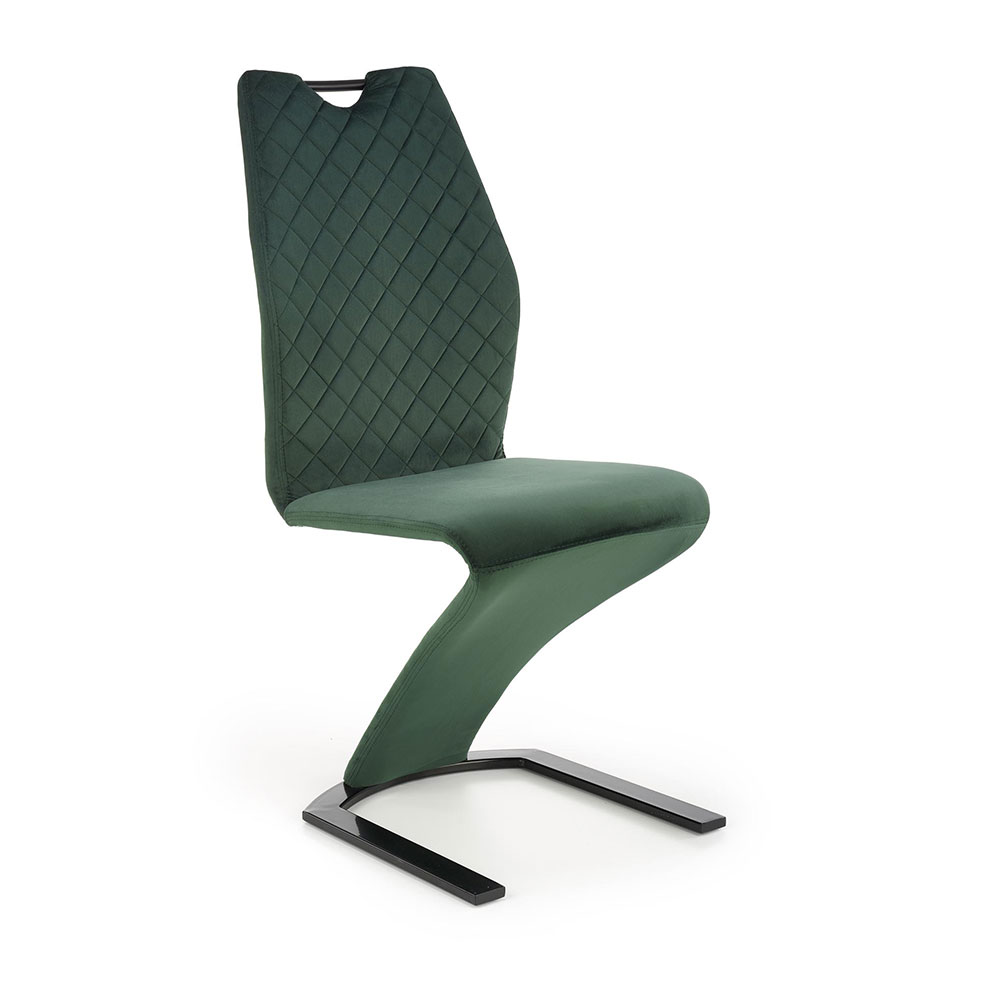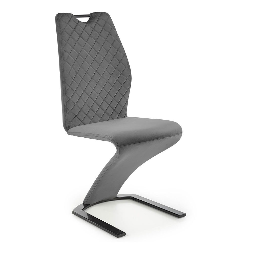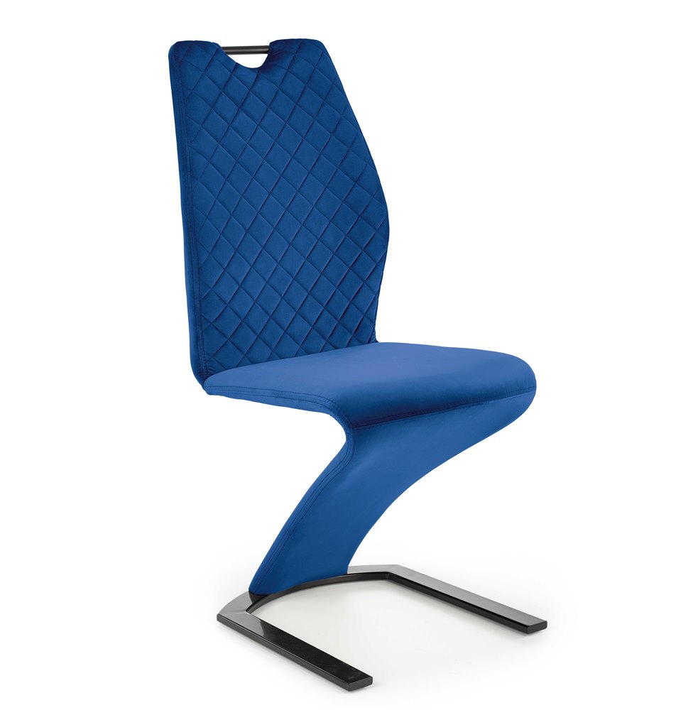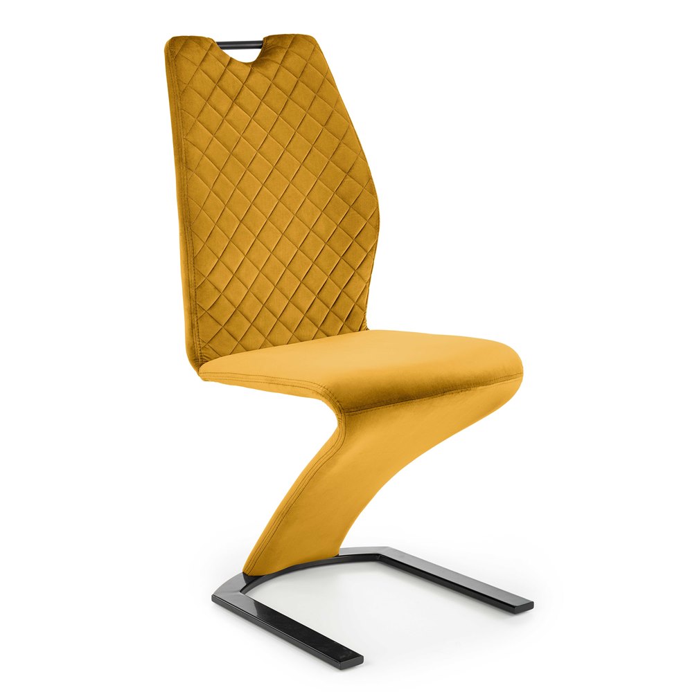 Модернистичен трапезен стол, изработен от кадифе с гръб на ромбоиди и извита тапицирана основа върху черен метал.