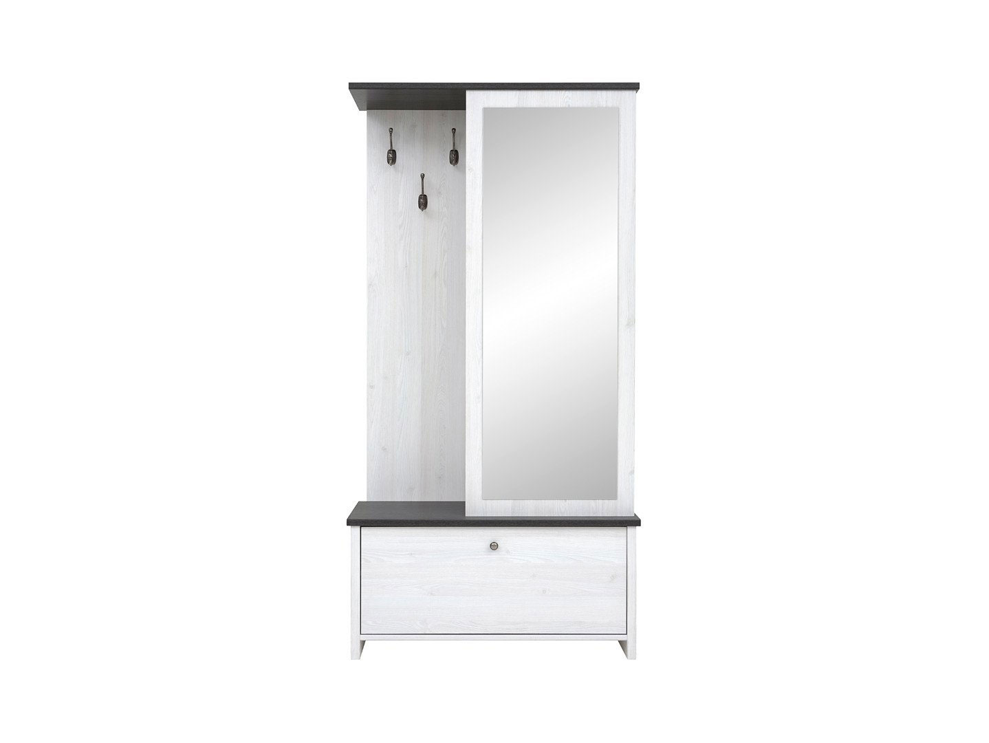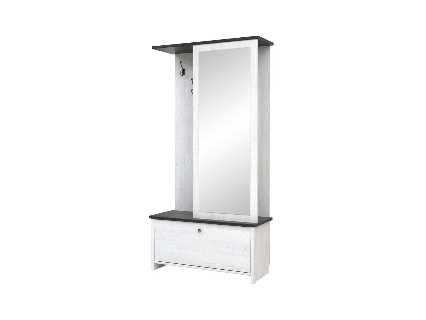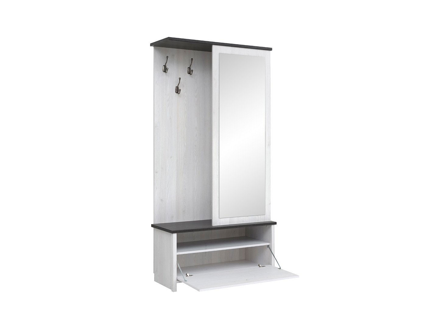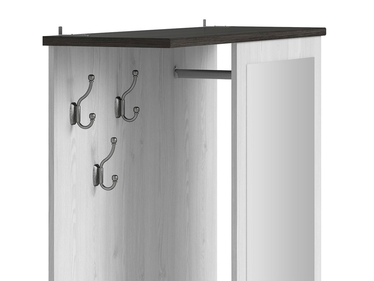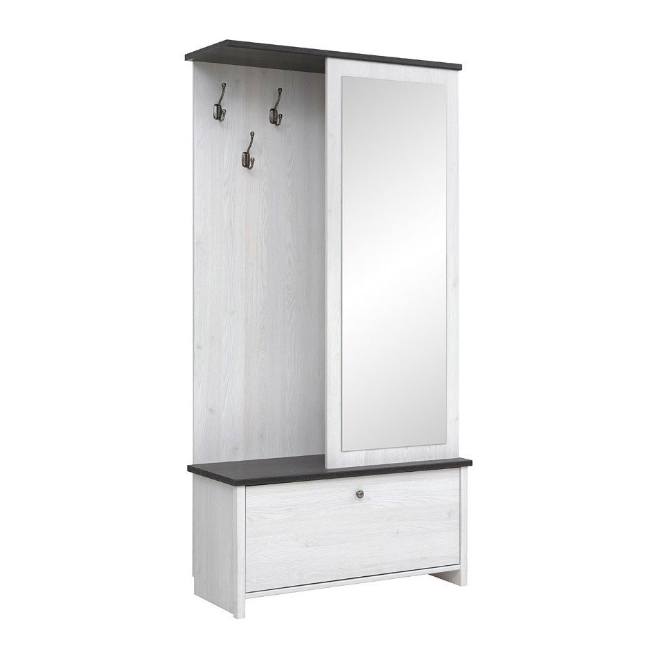 Модерно портманто с три стенни закачалки, лост за закачалки, огледало и долен шкаф за обувки с падаща вратичка в цвят бяла лиственица и бор ларико, модулна система Порто.
