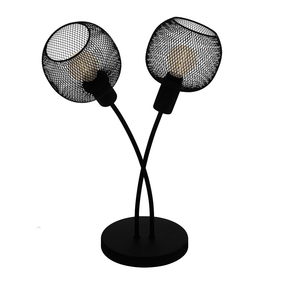 Настолна лампа с кръгла основа, наподобяваща цвете с две метални решетъчни тела в черно Eglo, серия Wrington 1.