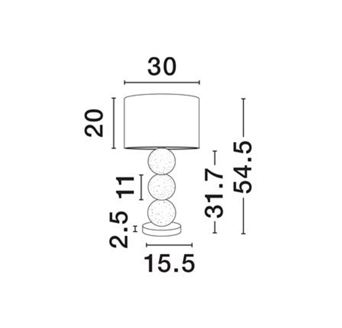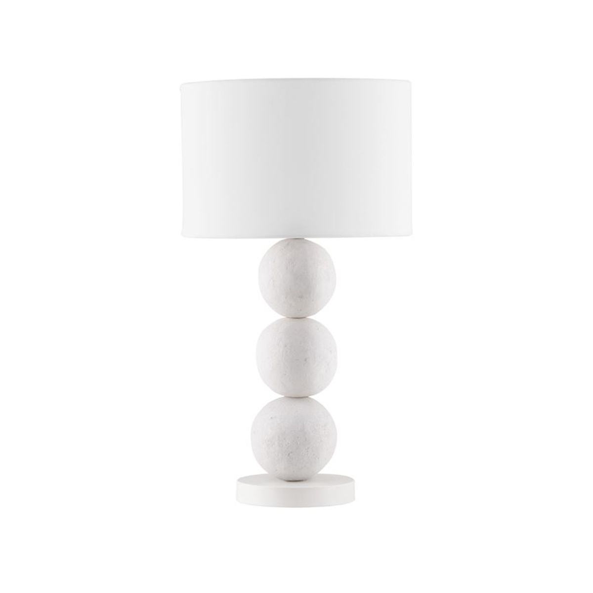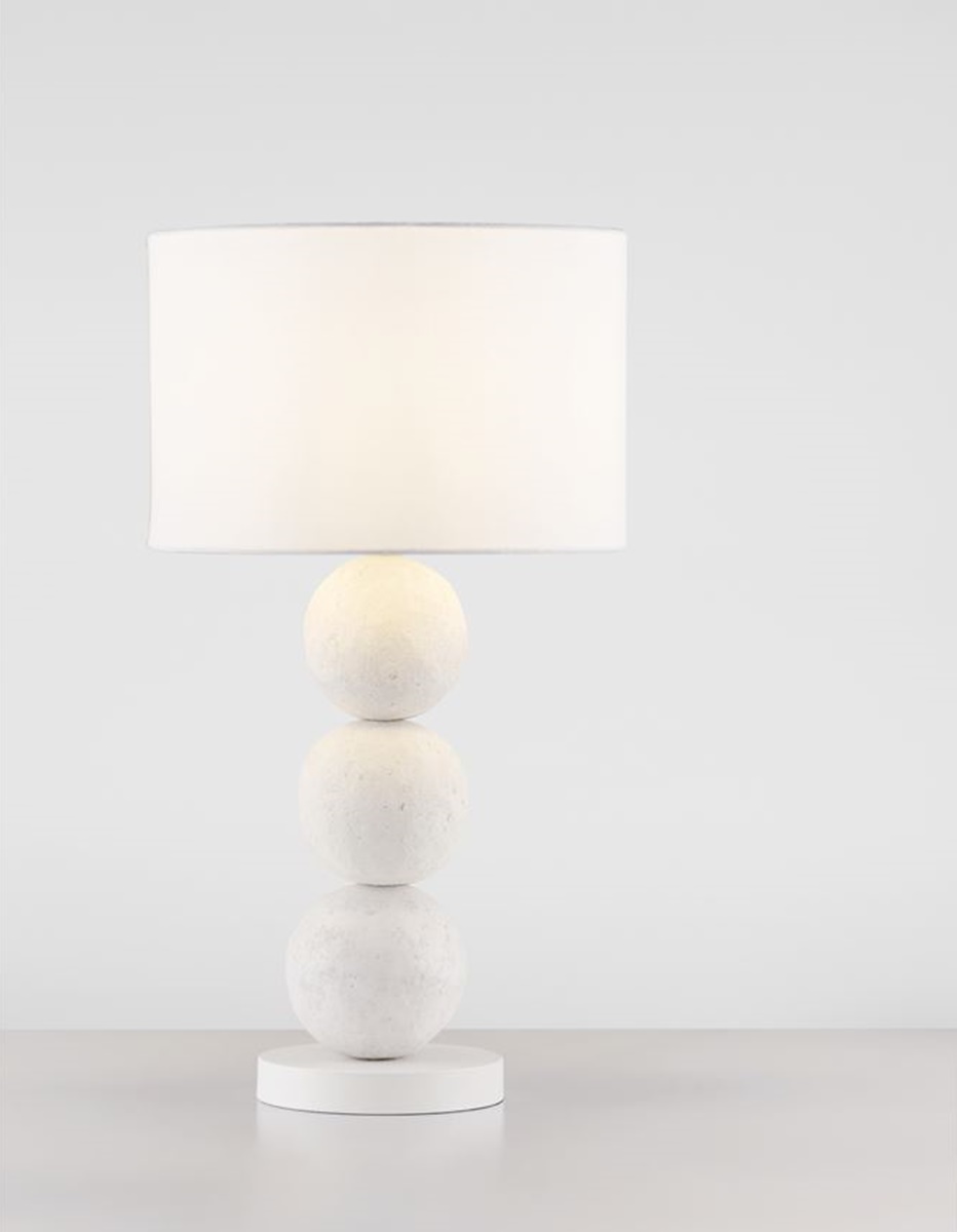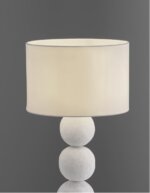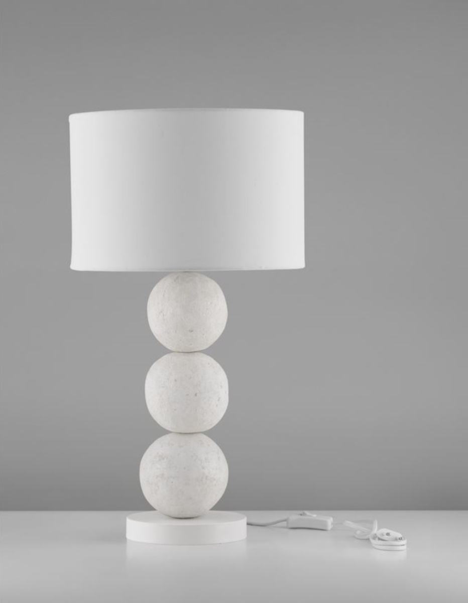 Настолна лампа с 3 бели топки, имитиращи камък, впечатлява с уникалния си дизайн и елегантно подредена основа, изработена с техниката папие маше. Класическият цилиндричен абажур в мек бял оттенък осигурява нежна и разсеяна светлина, създавайки уютна и релаксираща атмосфера.
