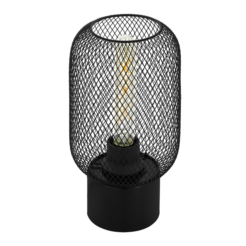 Настолна лампа с кръгла основа и цилиндрична метална решетка в черно, Eglo, серия Wrington.