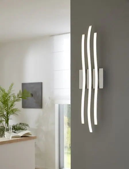 Нестандартен LED плафон/аплик, изработен от алуминий, стомана и пластмаса в цвят бяло и хром, напомнящ вълни Eglo, серия Roncade.