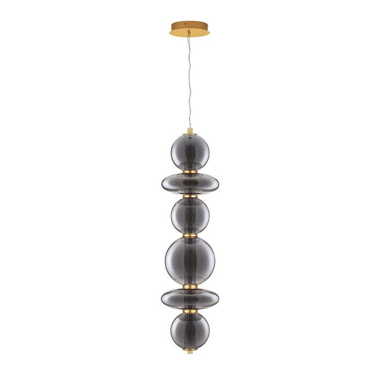 Комбинацията от месингово злато и опушено сиво стъкло придава елегантност, а геометричните форми и изчистените линии подчертават съвременния дизайн.