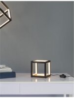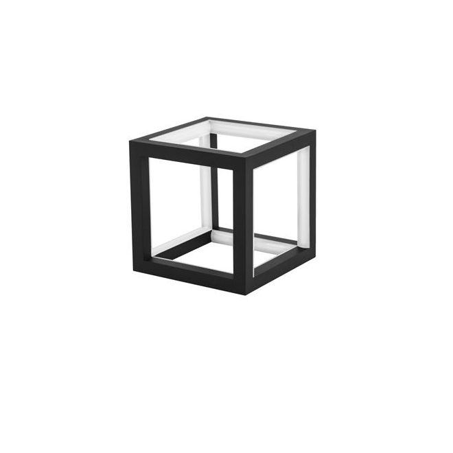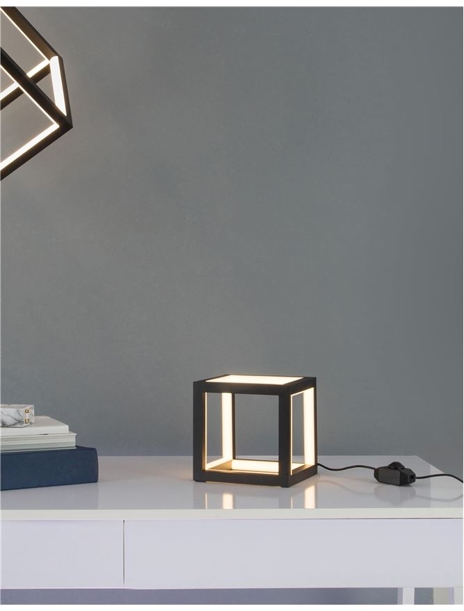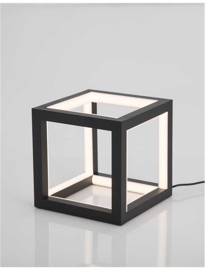 Нестандартна настолна лампа във формата на куб, изработена от алуминий и силикон.
