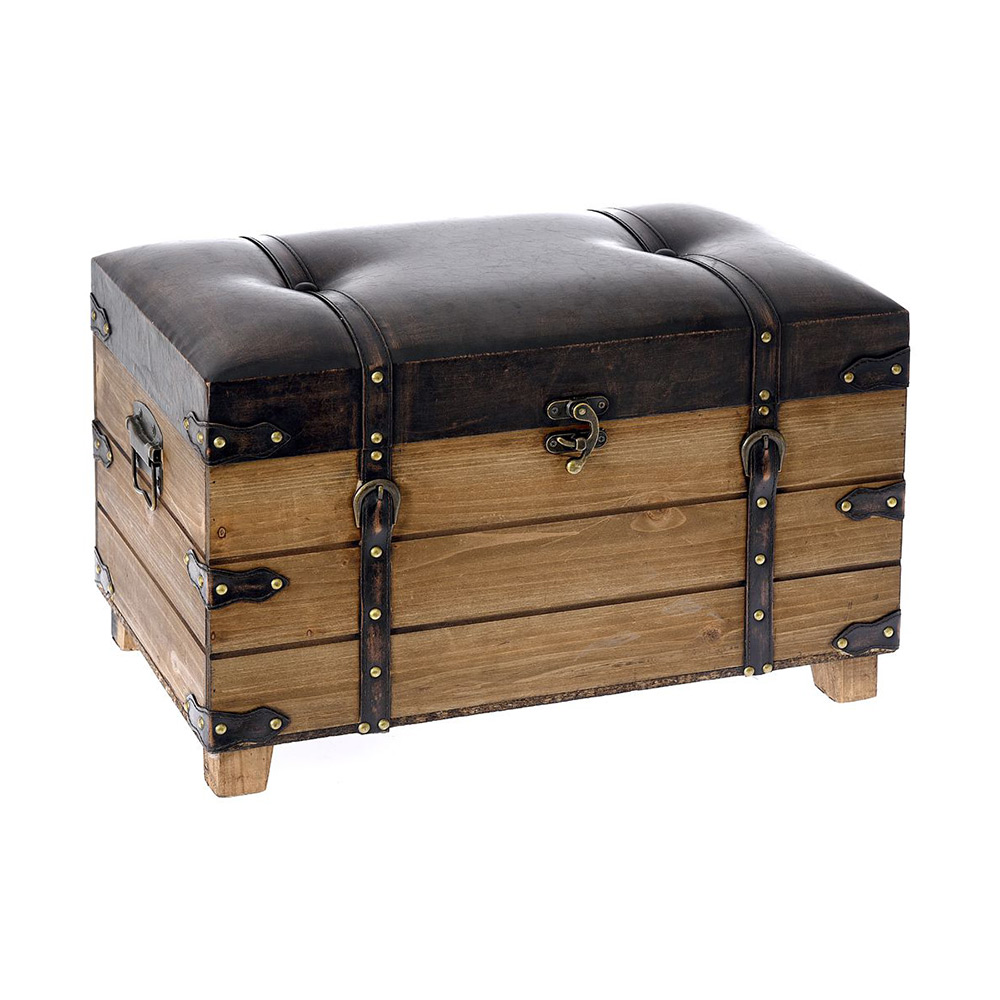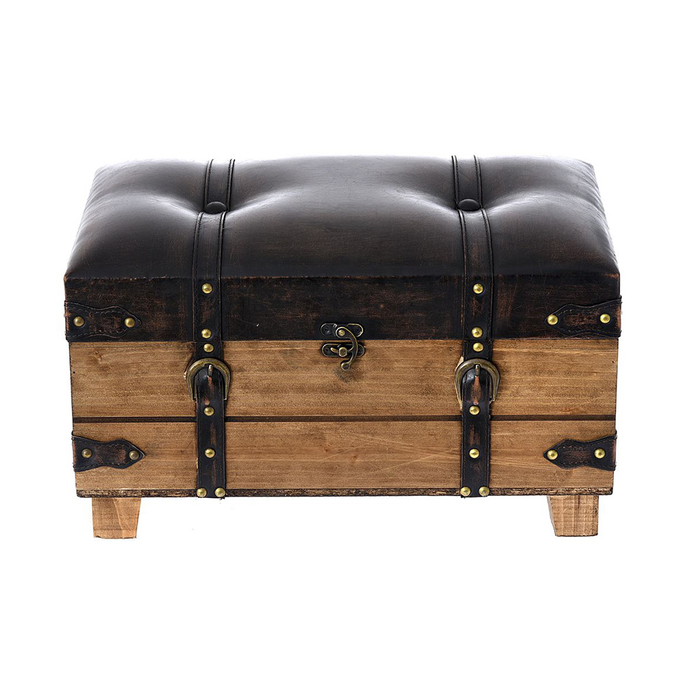 Дървена ниска табуретка с място за съхранение, имитираща куфар от кафява еко кожа с колани като закопчалки и завършващи детайли по ъглите.