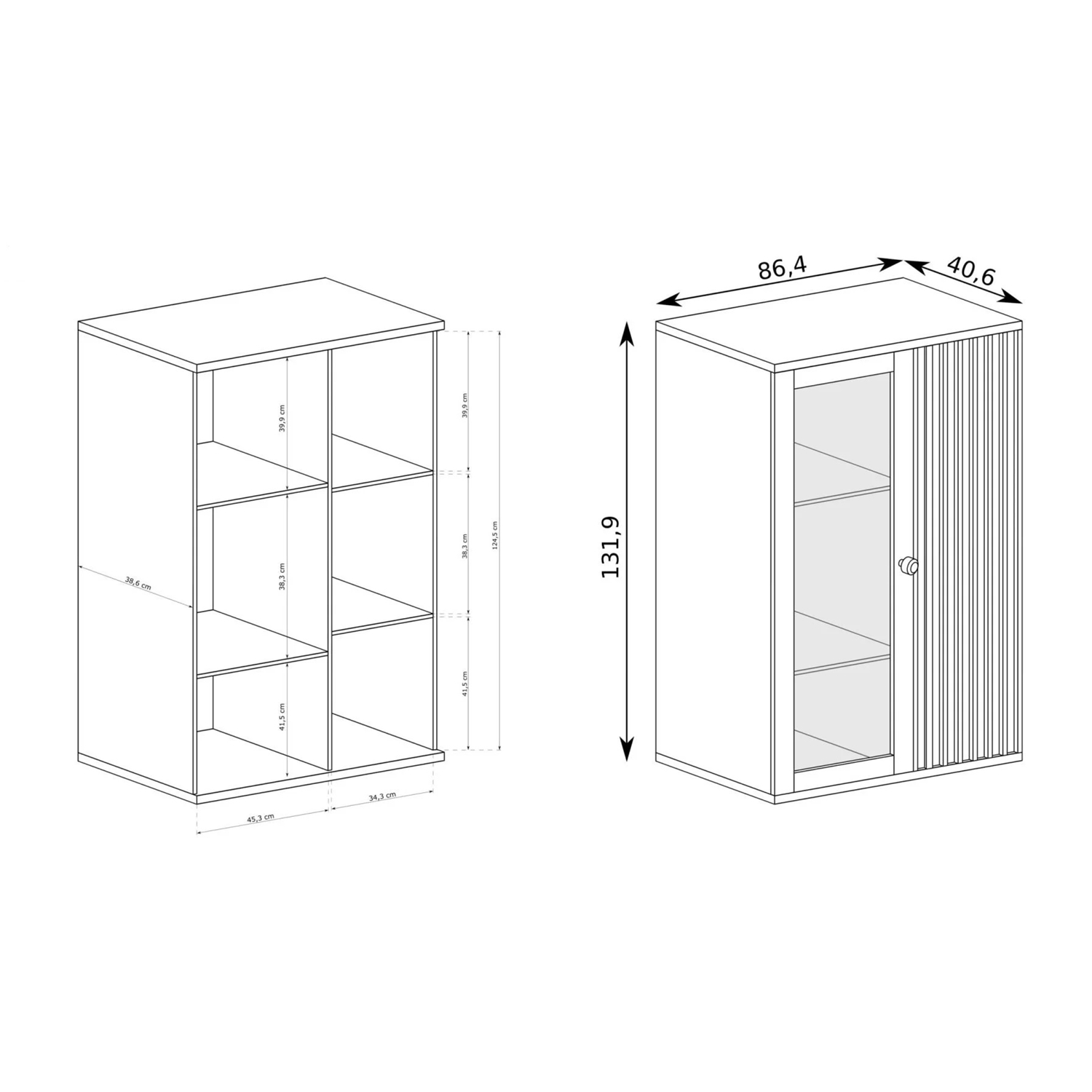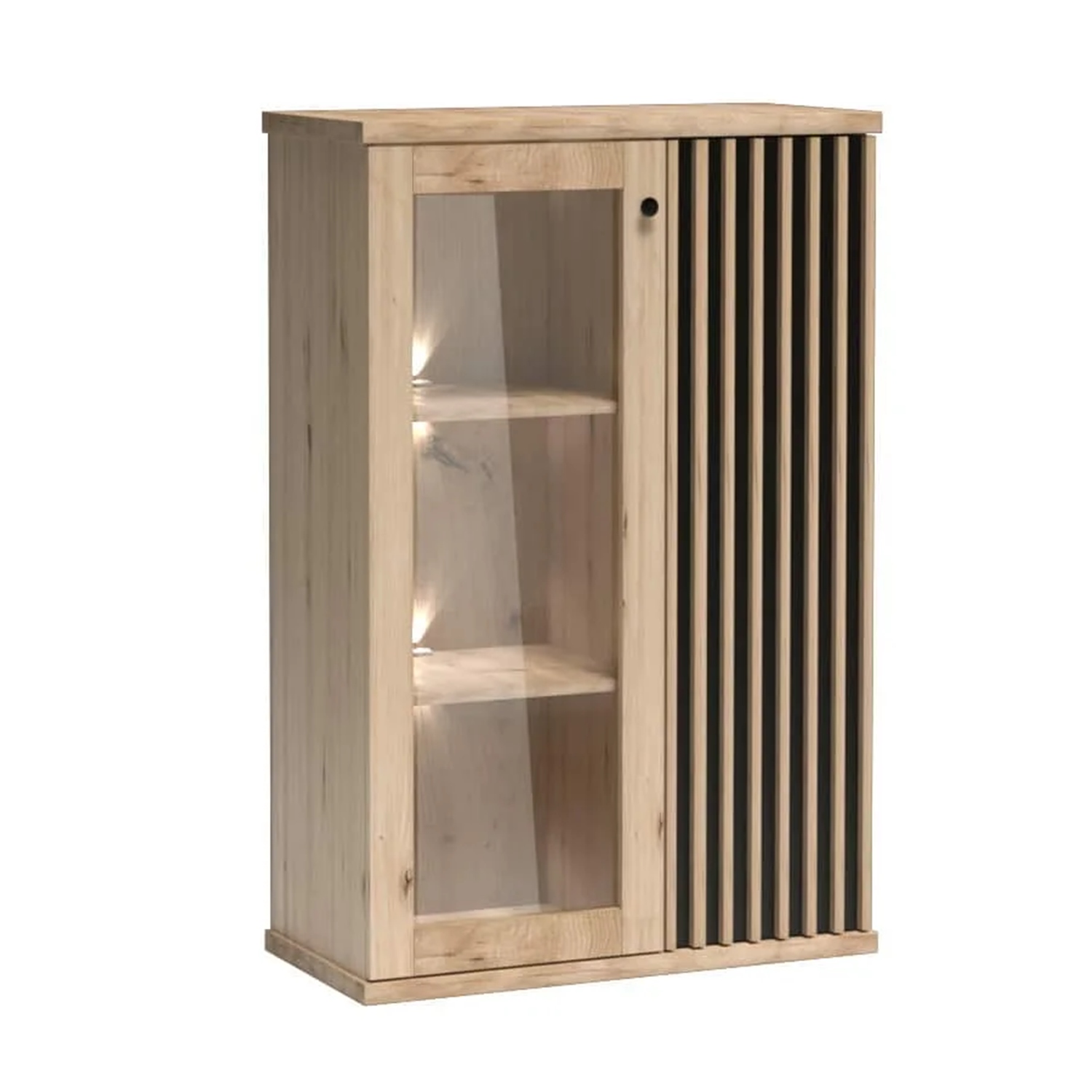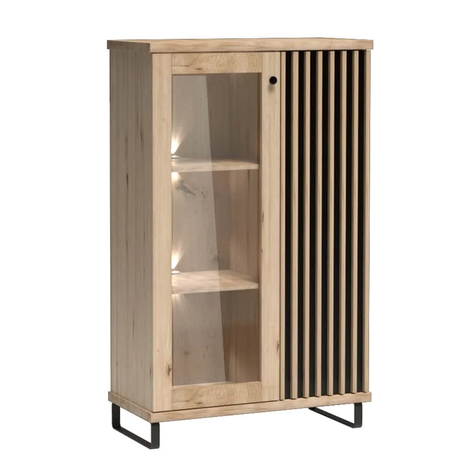 Ниска витрина със стъклена фасада и вградени рафтове, серия Cali – съчетава стил и функционалност.