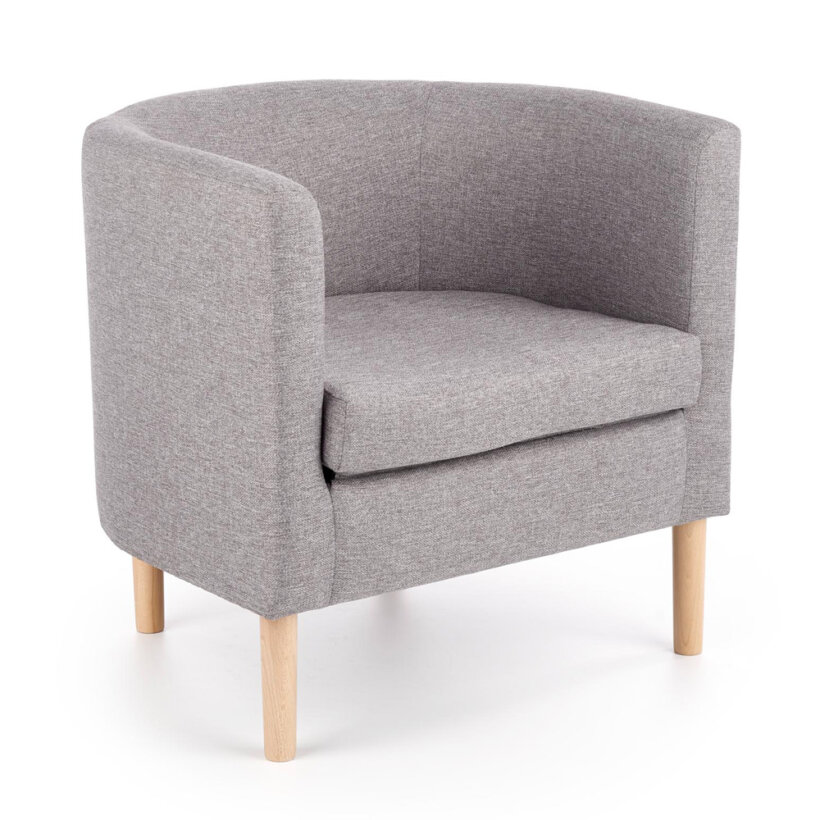 Ниско кресло със сива текстилна дамаска и дървени крачета в натурален цвят Орион.