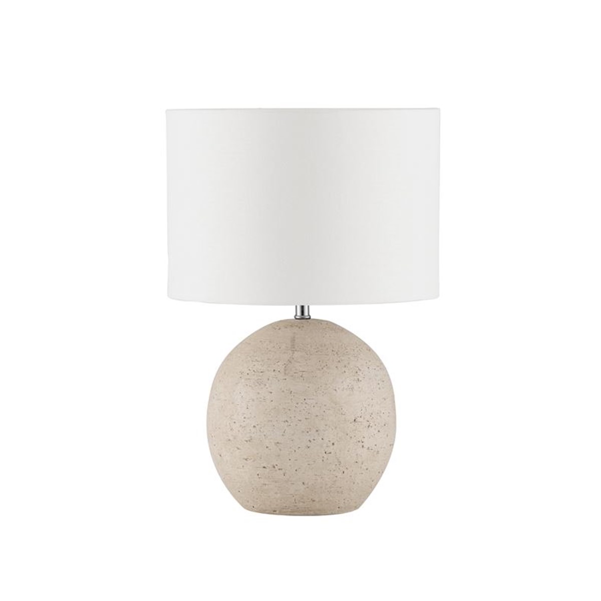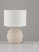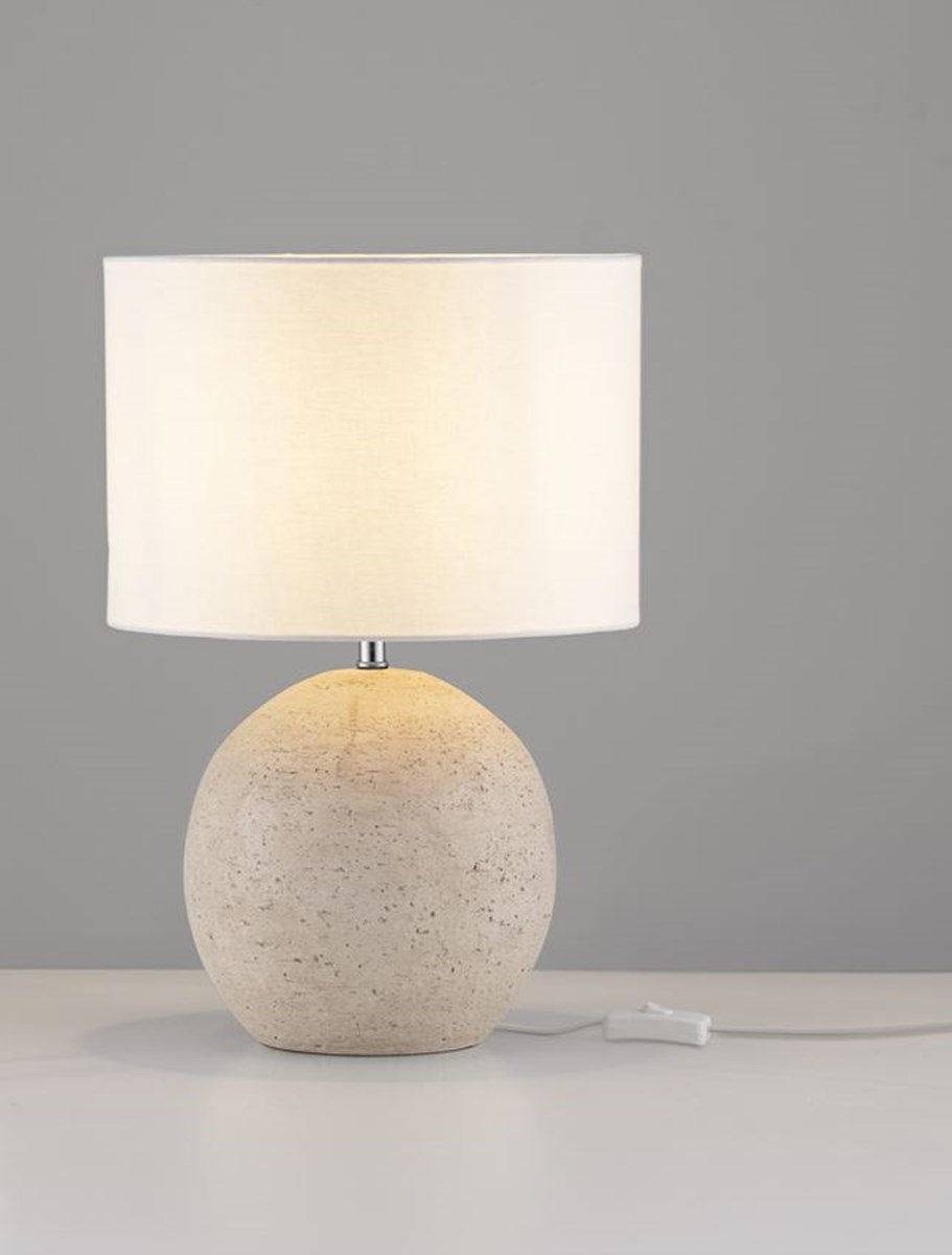 Нощна лампа със закръглена основа, имитираща състарена керамика в естествен бежов нюанс, и бял текстилен абажур, който допълва минималистичния ѝ дизайн. Създава топла и приветлива атмосфера в помещението.