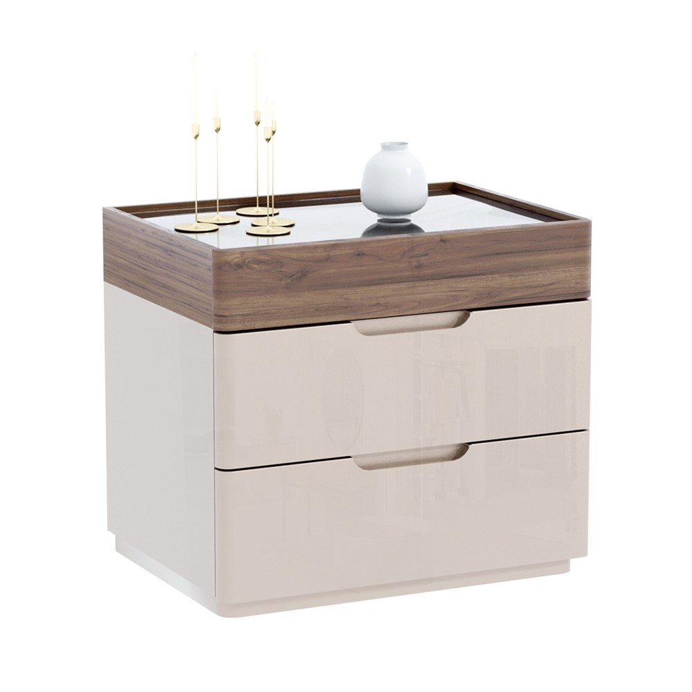 Нощно шкафче с две чекмеджета в мек пясъчен цвят, прозрачен плот от закалено стъкло и плитък рафт под него, серия Бриел.