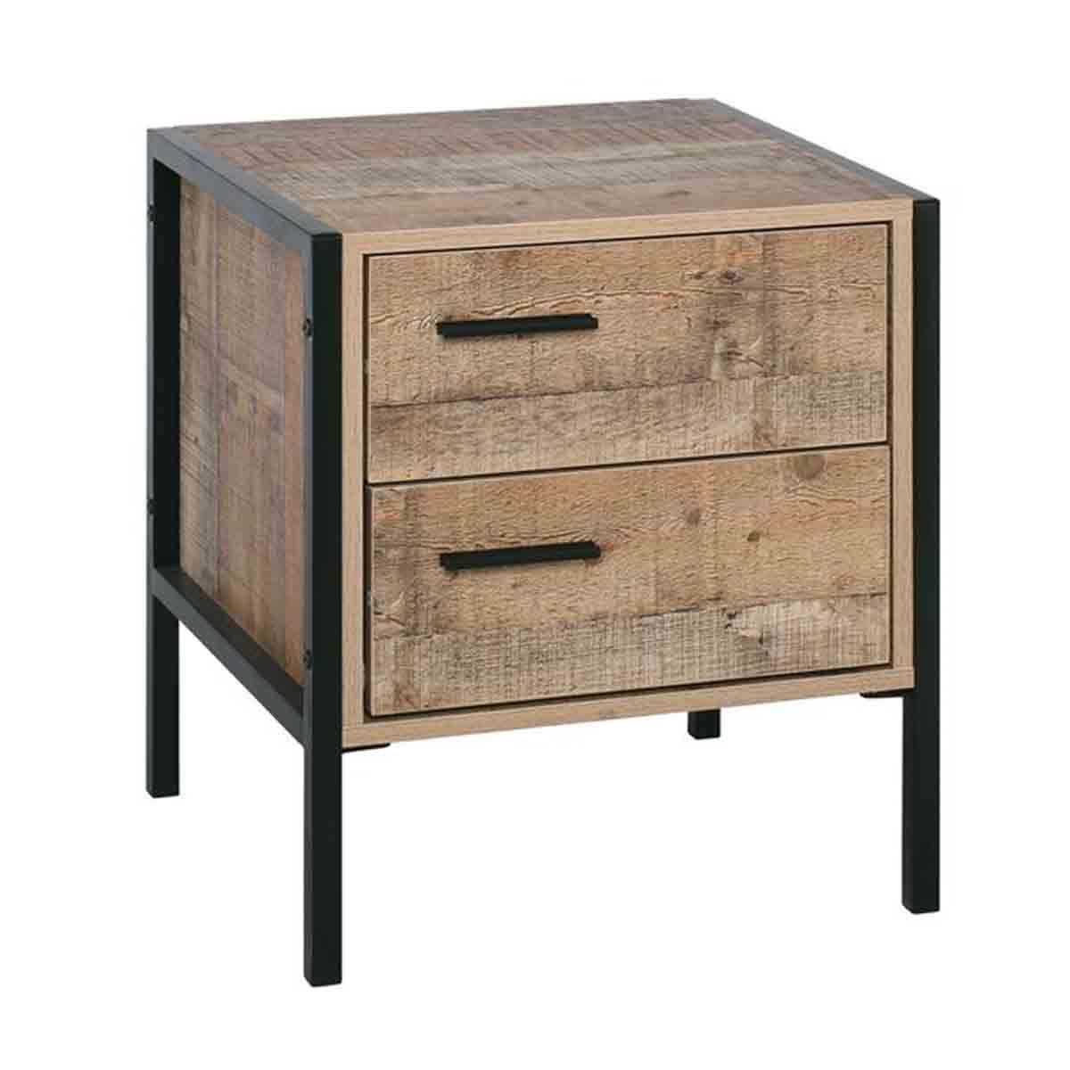 Нощно шкафче с две чекмеджета в индустриален стил, изработено от черен метал и дърво в цвят античен дъб, серия Пако.