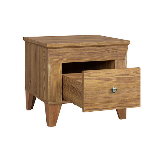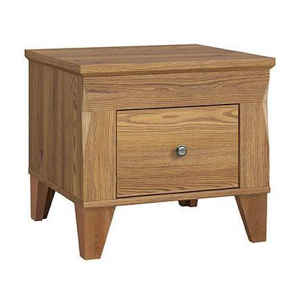 Нощно шкафче с едно чекмедже и малка метална дръжка, изработено от ПДЧ и МДФ в цвят златна лиственица върху дървени крачета, модулна система Берген.