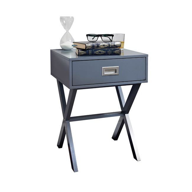 Елегантно нощно шкафче, изработено от МДФ в сив цвят, с едно чекмедже и метална дръжка.