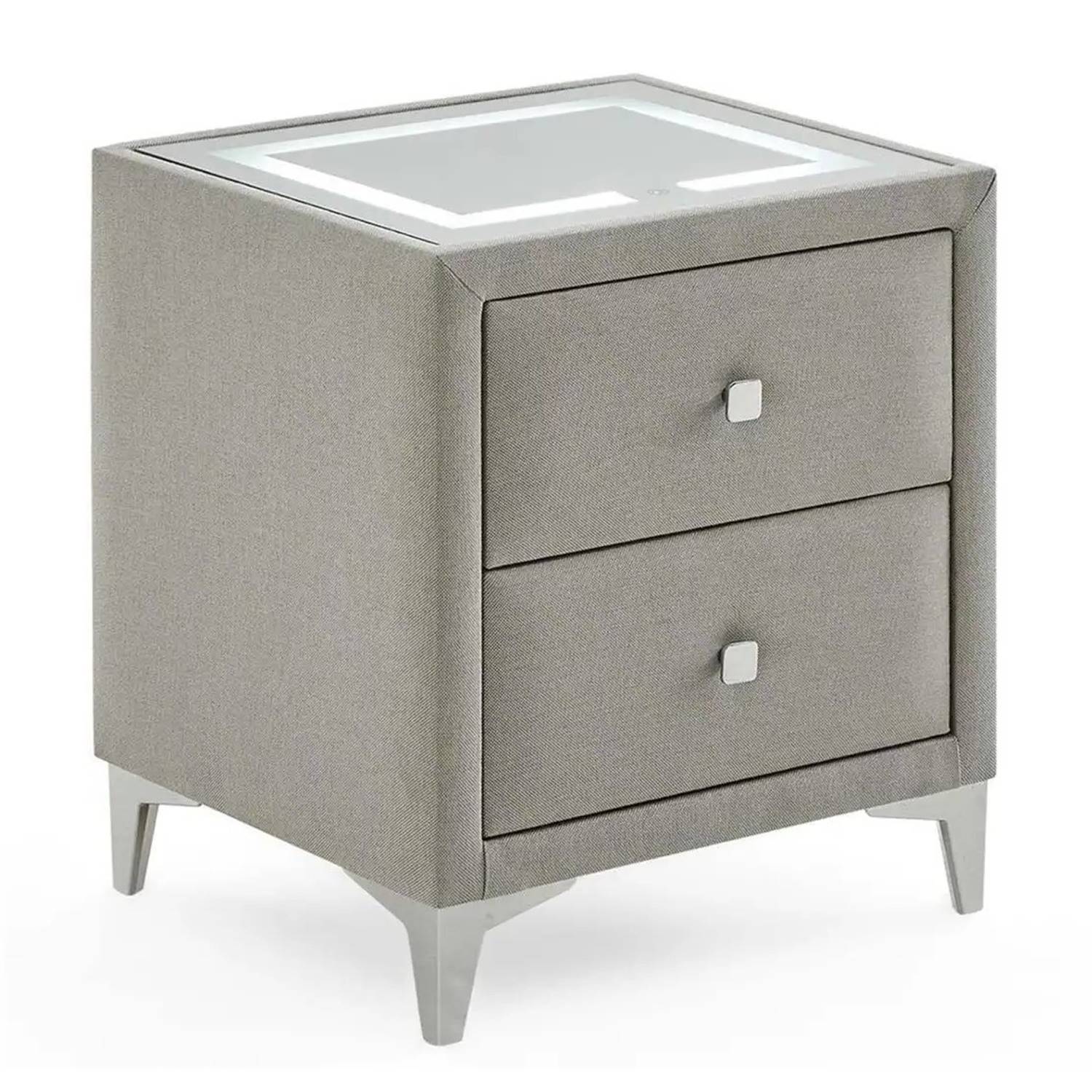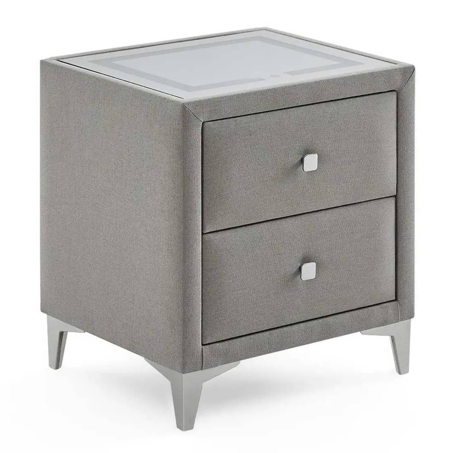 Изработено е с текстилна дамаска в елегантен сив цвят и разполага с две чекмеджета с дръжки, осигуряващи удобно място за съхранение на лични вещи и аксесоари.
