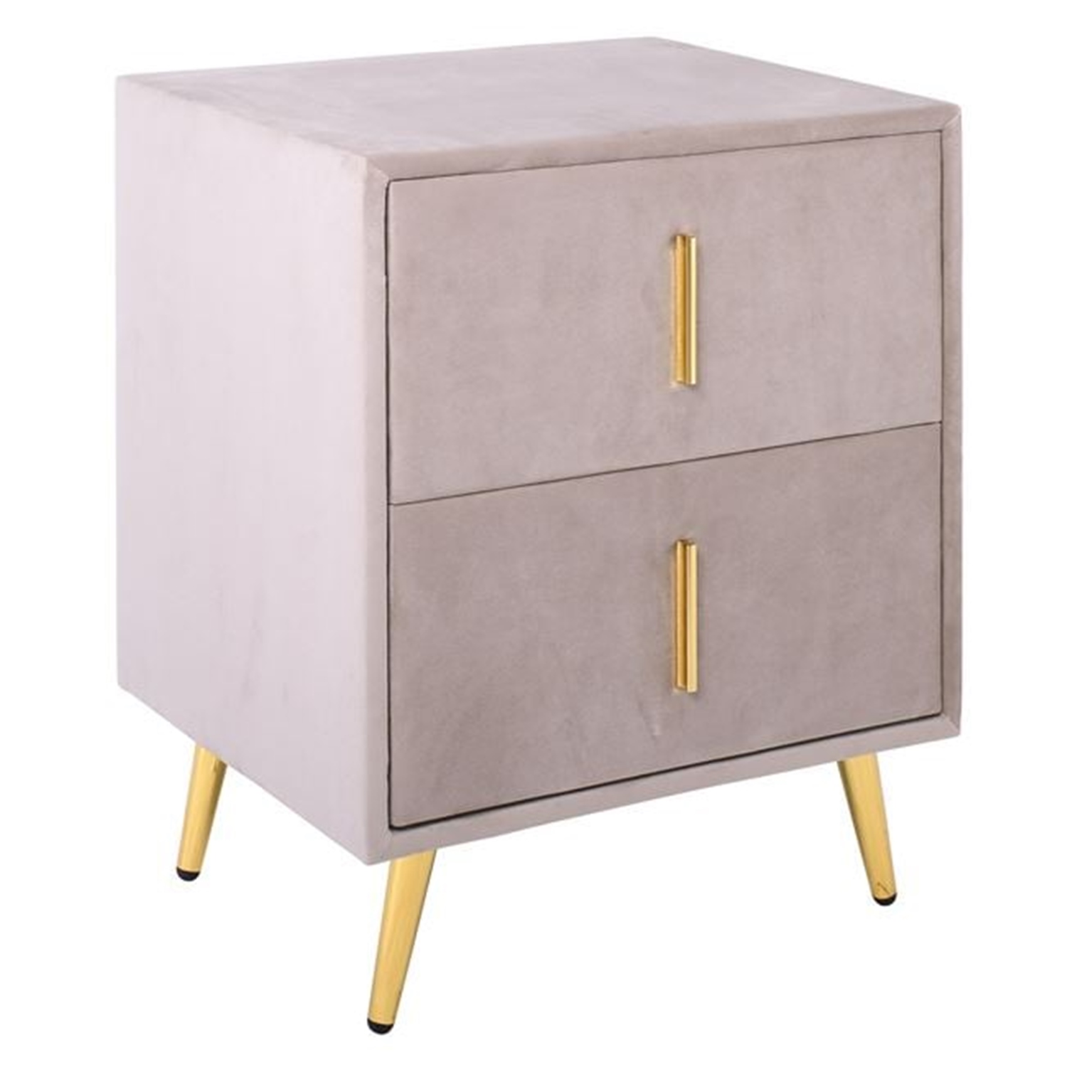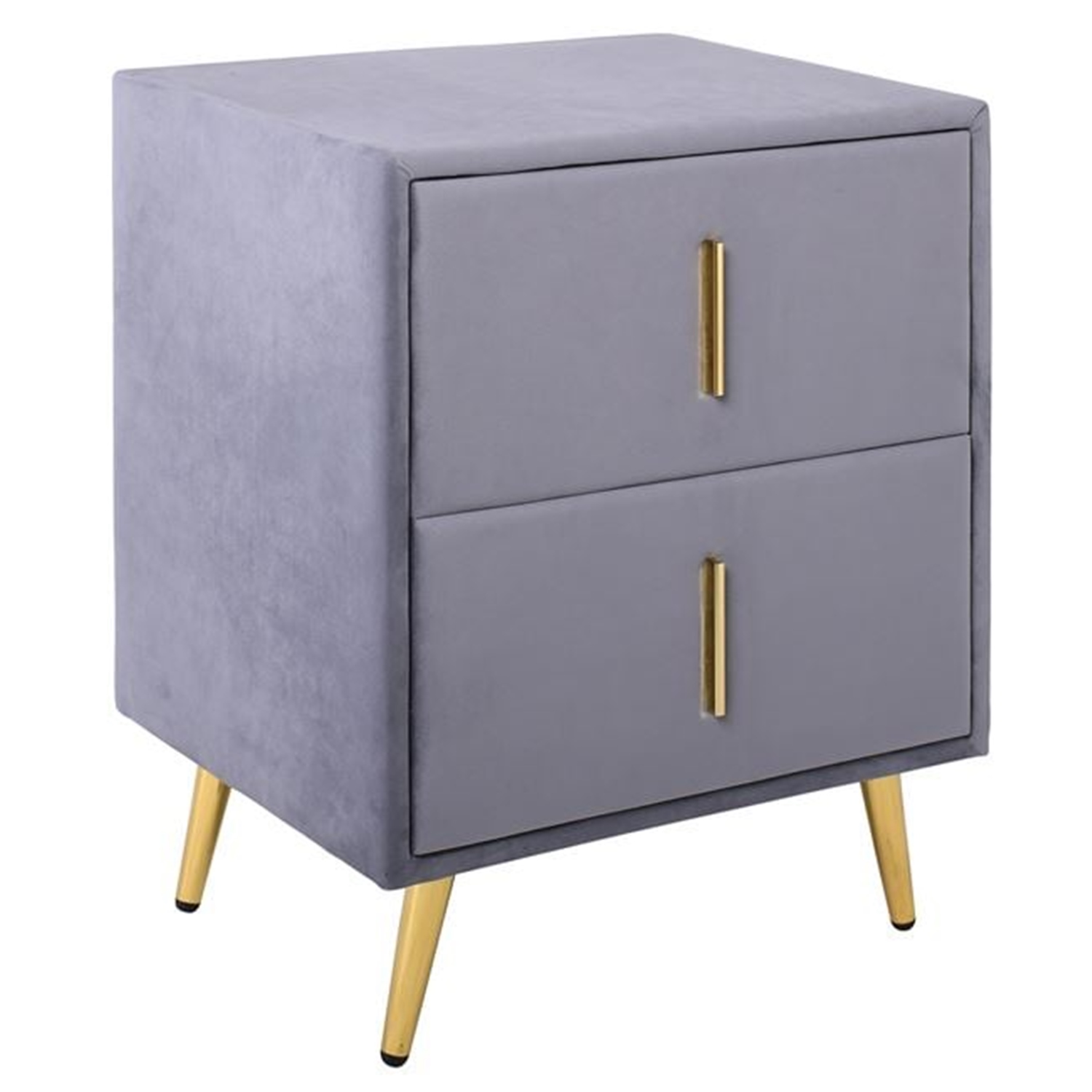 Елегантно нощно шкафче с тапицерия от велур в сив цвят, придаващ луксозно излъчване и уют.