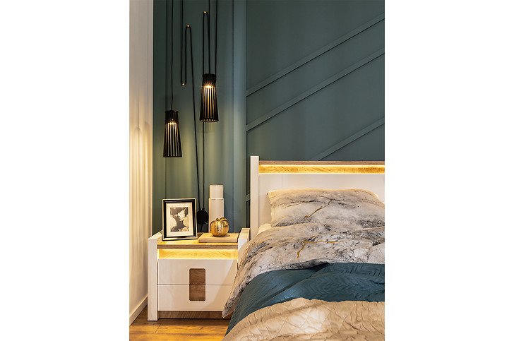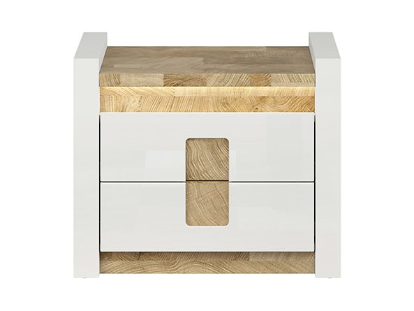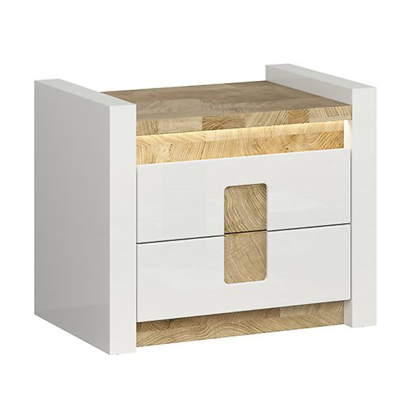 Луксозно нощно шкафче, изработено от МДФ и ПДЧ с две чекмеджета в бял гланц, детайли в цвят уестминстърски дъб и вградено LED осветление в горната част, модулна система Аламеда.