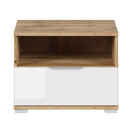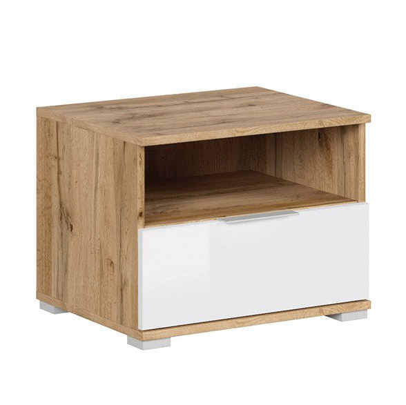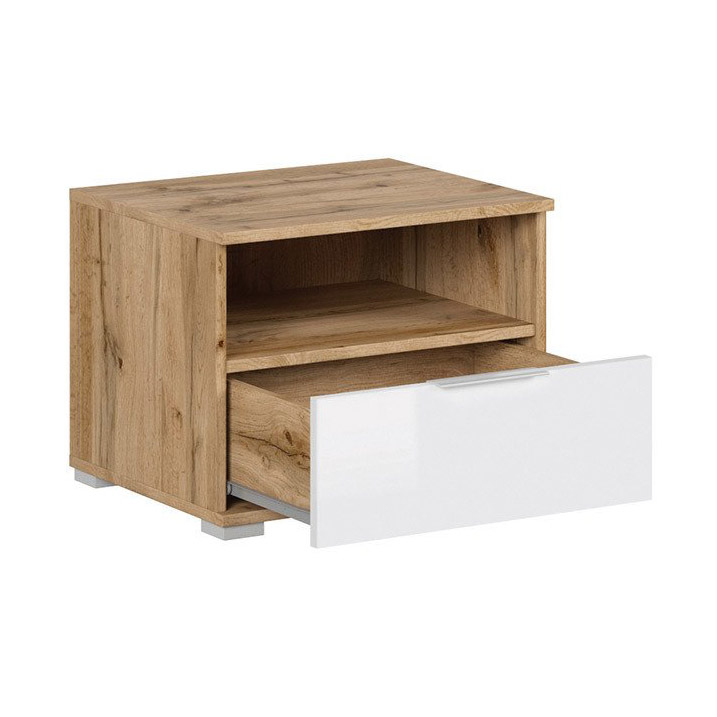 Нощно шкафче, изработено от ПДЧ с чекмедже в бял гланц и корпус в дървесен цвят дъб вотан с елегантни дръжки и крачета, модулна система Зелле.