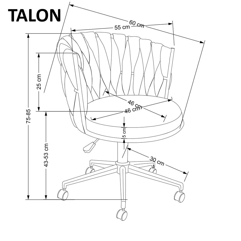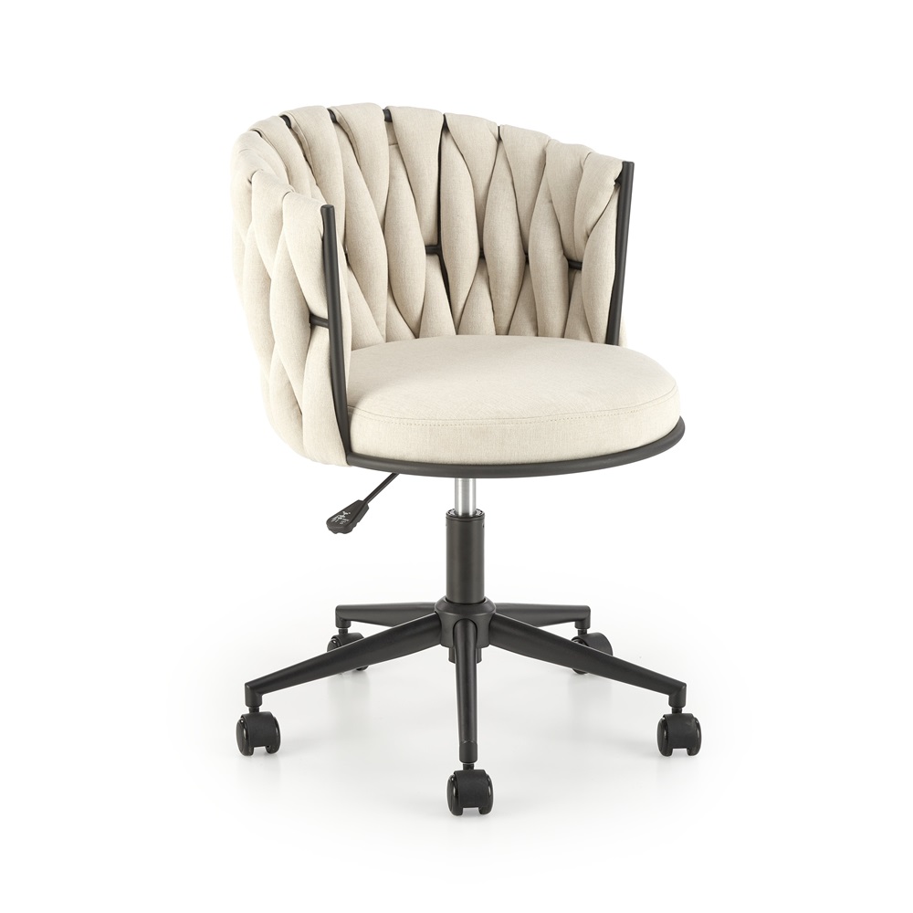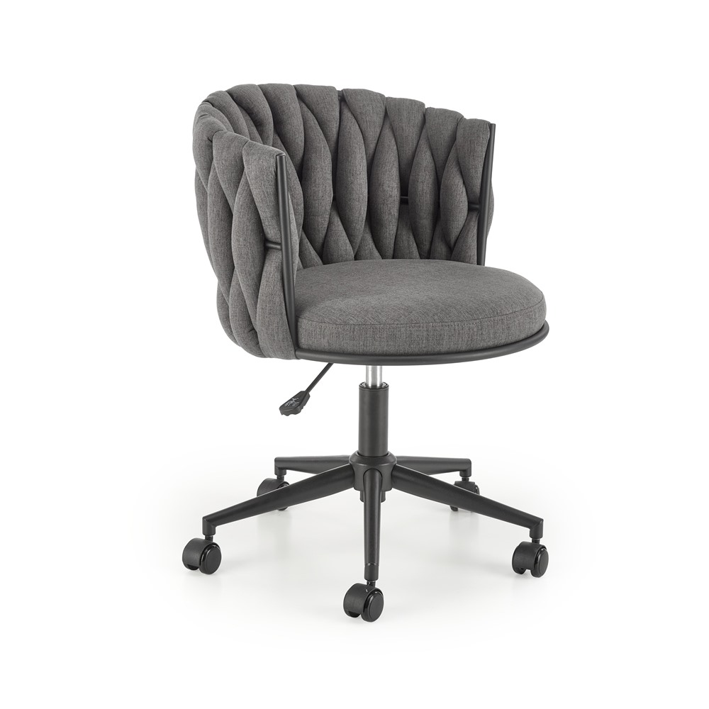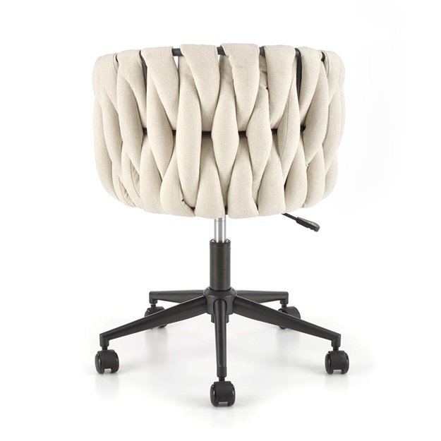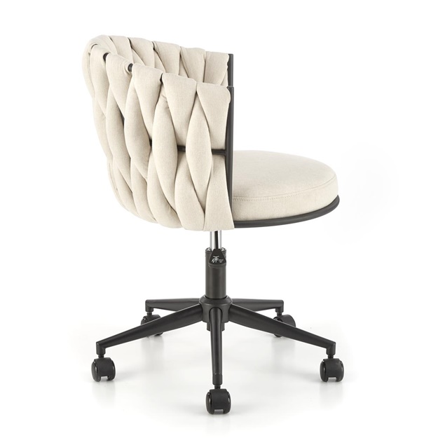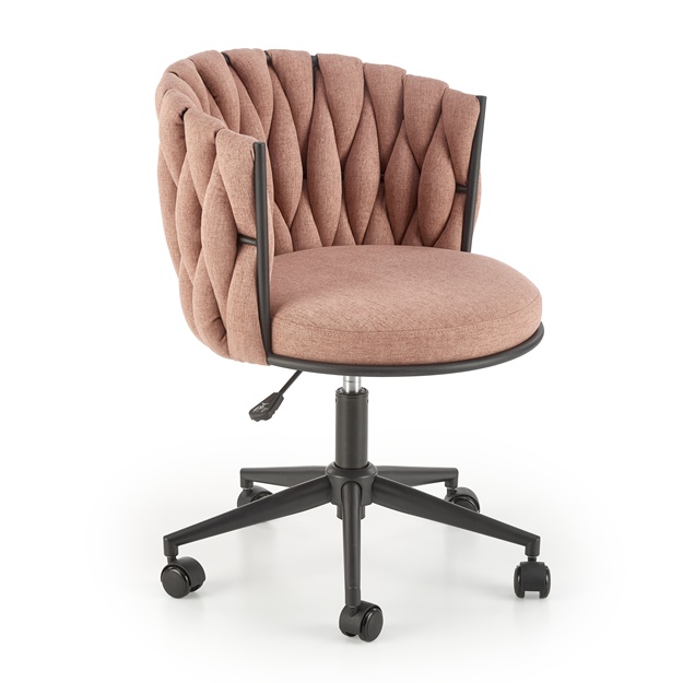 Офис стол с нетрадиционна облегалка, основа на колелца и механизъм, регулиращ височината на седалката.