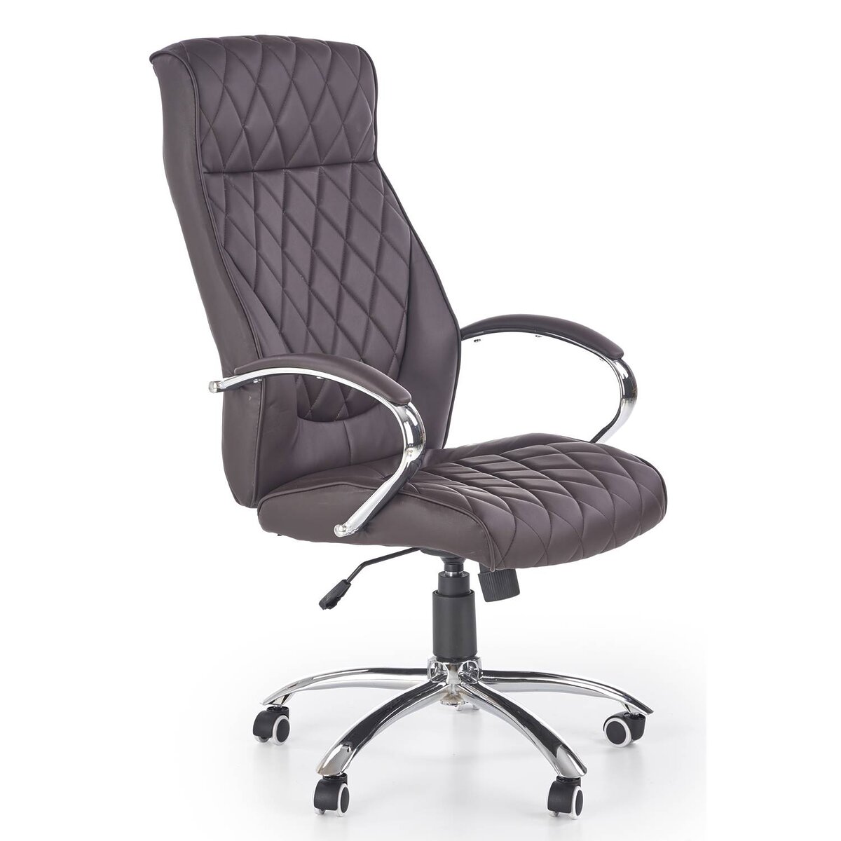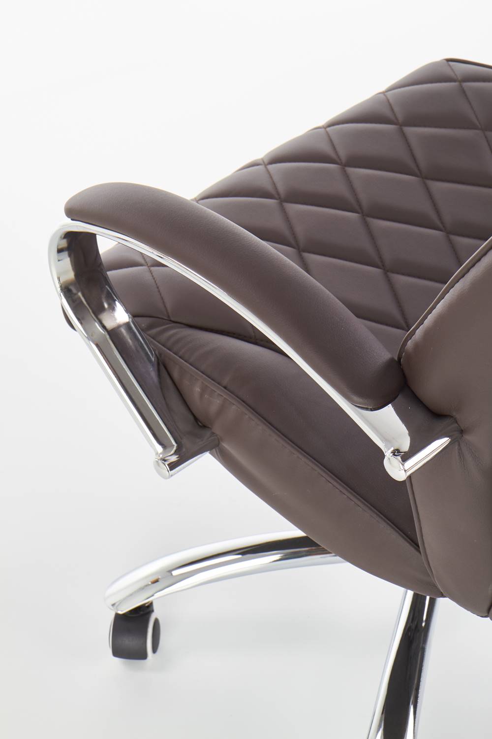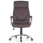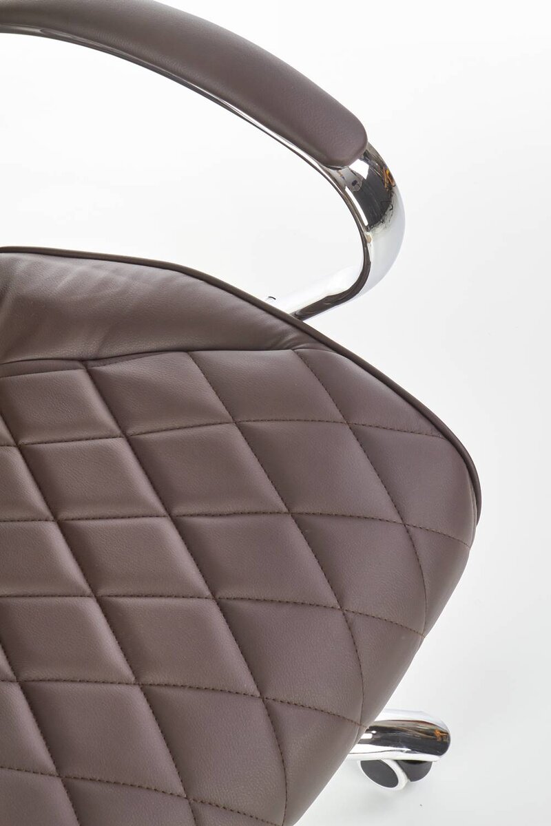 Удобният офис стол е изработен от устойчива еко кожа в тъмнокафяв шоколадов цвят и хромирана основа на колелца.
