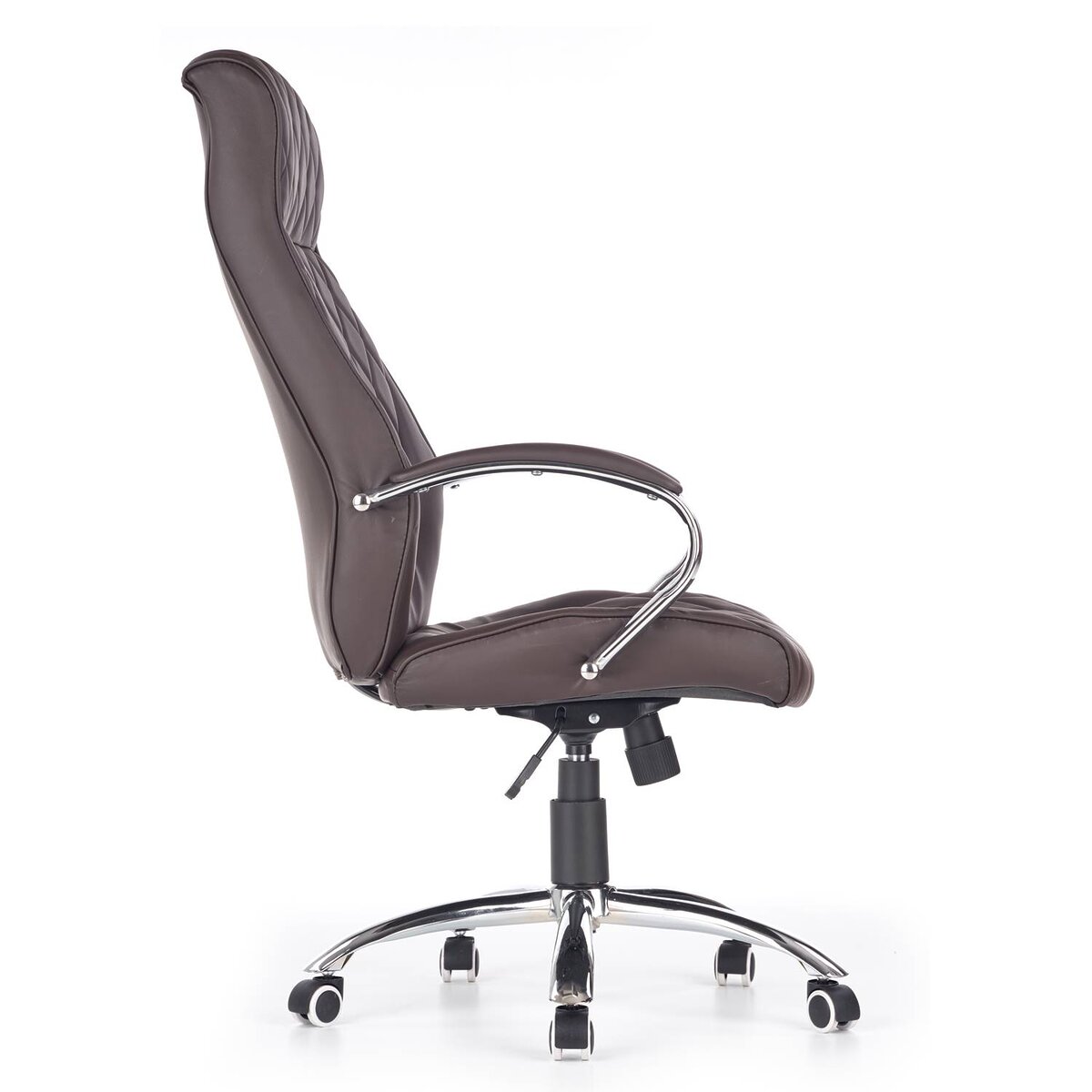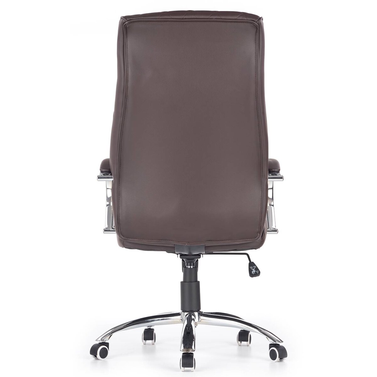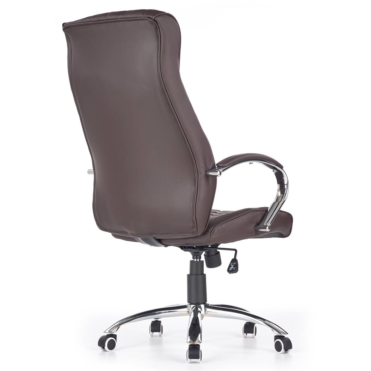 Удобният офис стол е изработен от устойчива еко кожа в тъмнокафяв шоколадов цвят и хромирана основа на колелца.