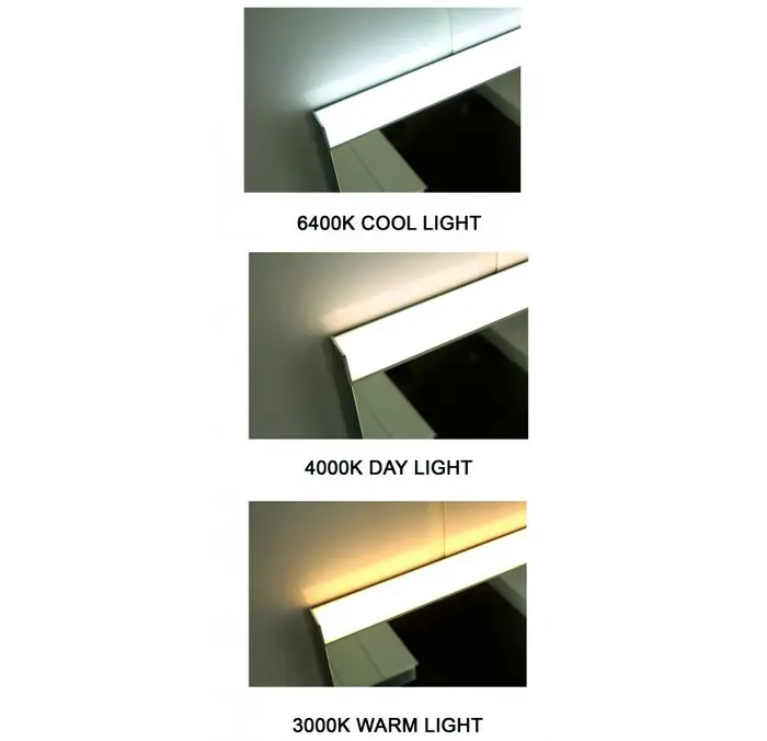 Модерно правоъгълно огледало за баня с LED осветление, предлагащо възможност за регулиране на цветната температура в три степени – студена, дневна и топла светлина.