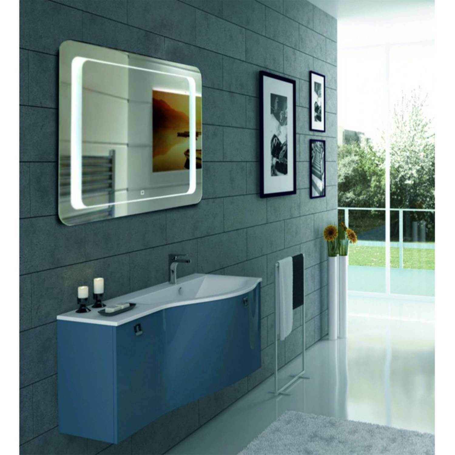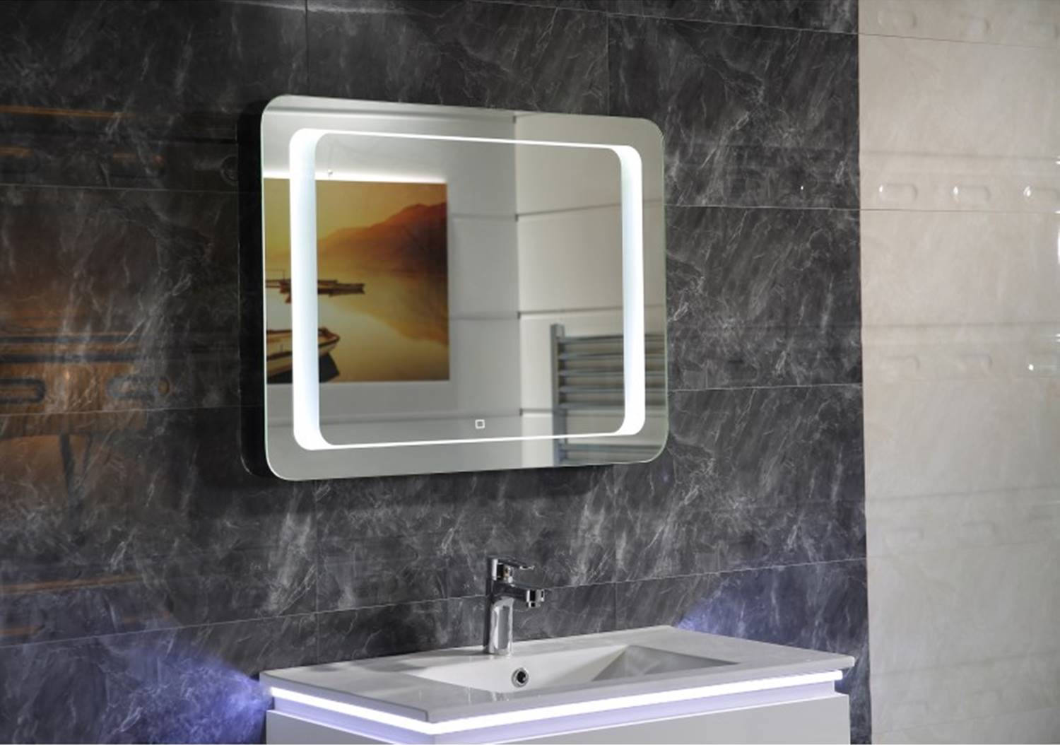 Атрактивно огледало за баня с нагревател, вградено LED осветление бутон и touch screen за активация.