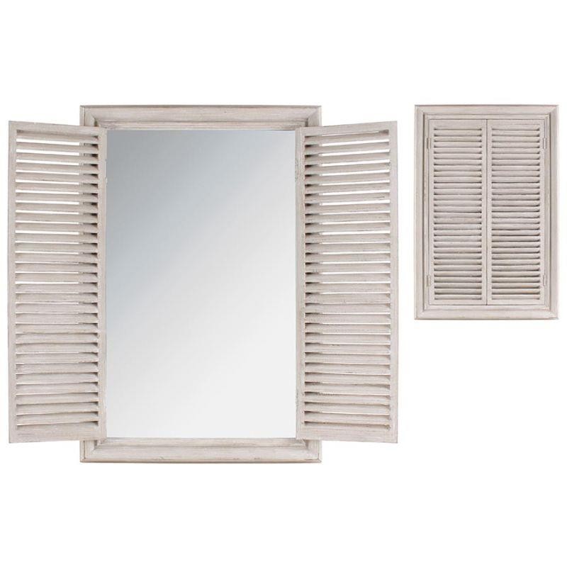 Огледало с дървена рамка в състарен бежов цвят, която имитира прозорец с капаци. Може да стои отворено или затворено.