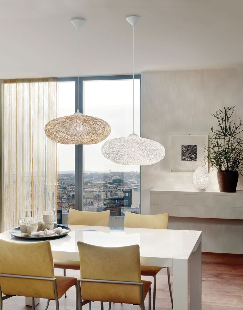 Овален пендел, изработен от пластмаса в бяло с тяло от сплетени нишки, Eglo, серия Campilо.