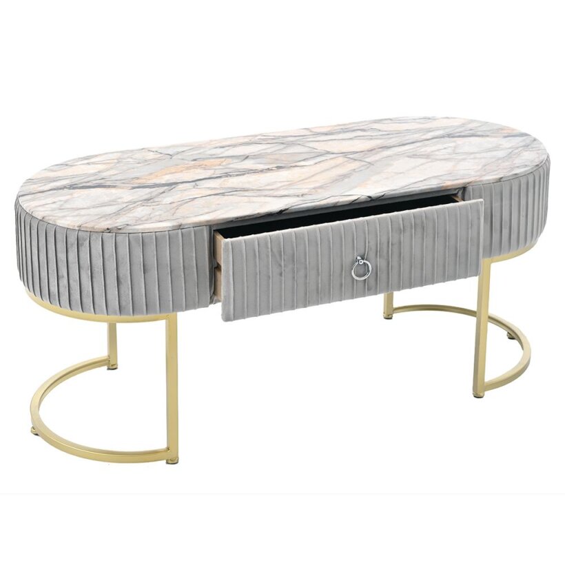 Овална холна маса с едно чекмедже и кръгла дръжка, изработена с интересна метална полуоснова в златисто, релефна страница в сиво кадифе и плот МДФ с мраморен ефект.