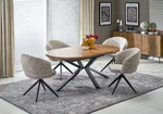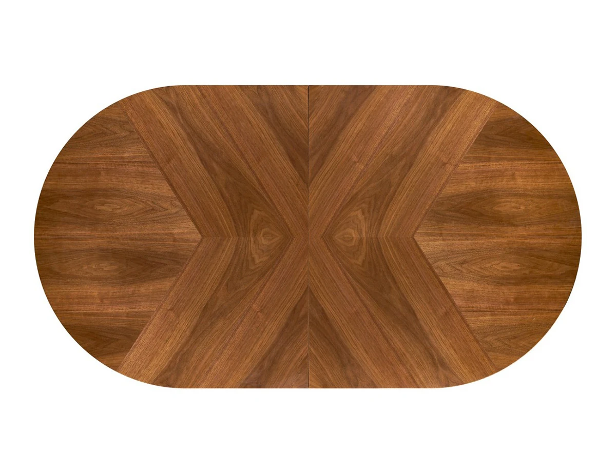 Овална трапезна маса с опция за разтягане M114 съчетава плот с естествен фурнир в цвят орех и метални черни крака с модерен дизайн.