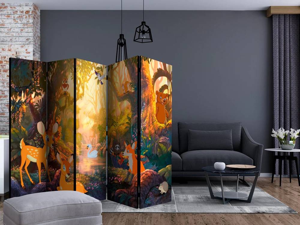 Този параван за детска стая с животни в гората се състои от 5 части, изработен е от дърво и е с двустранен печат. Той не само дискретно разделя пространството в детската стая, но също така изпълнява ролята на оригинална декорация. Благодарение на перфектно изработения и оригинален мотив с качество на печата Full HD, този параван с анимирани животни ще придаде неповторим чар на интериорa на всяка детска стая!