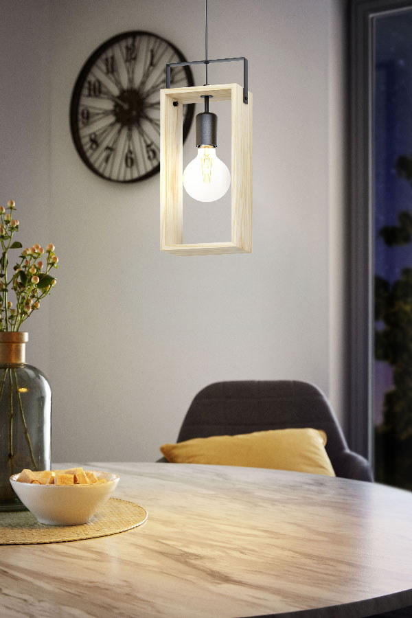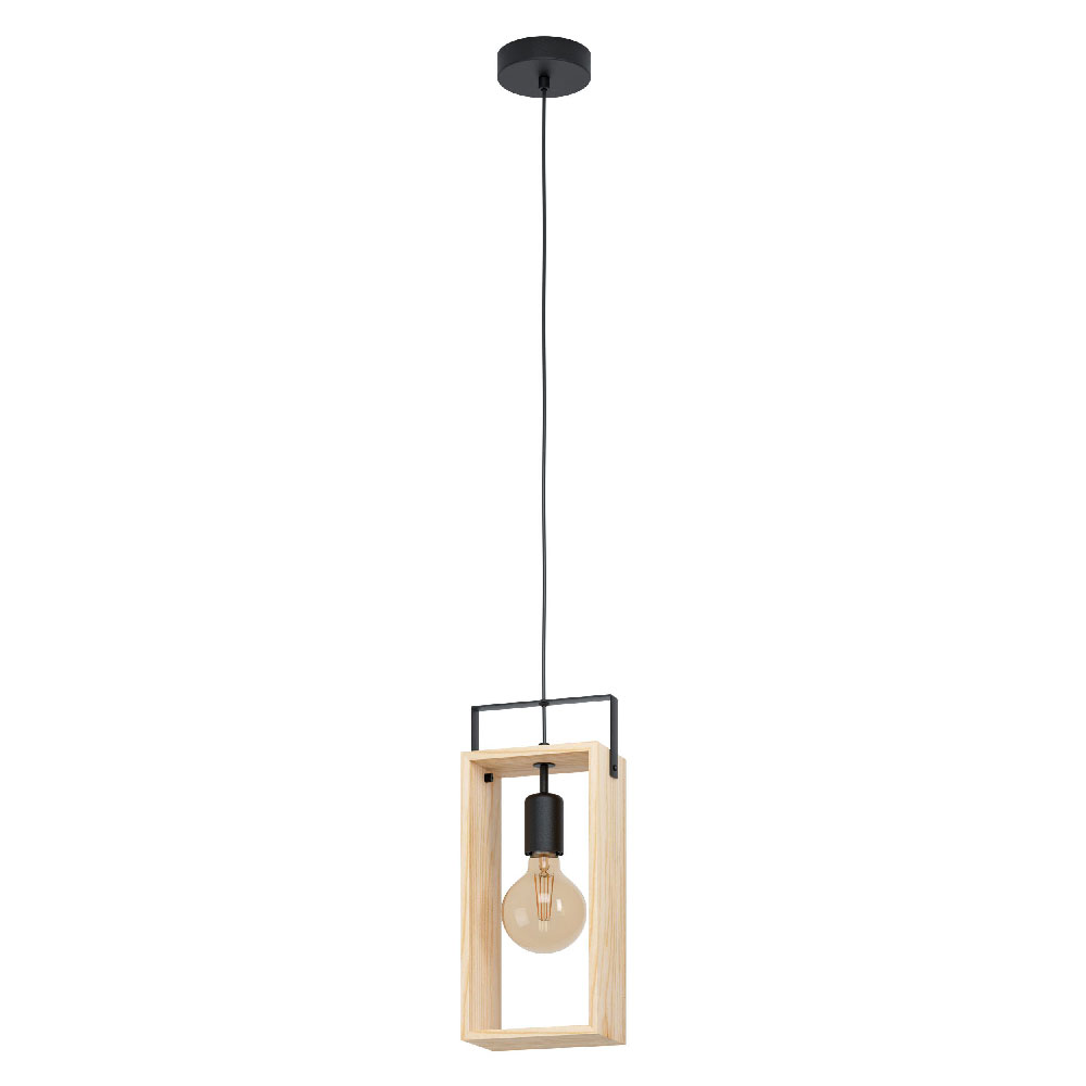 Модерен пендел с една или пет крушки, изработен от дърво в натурален цвят с акценти от черен метал, Eglo, серия Famborough.