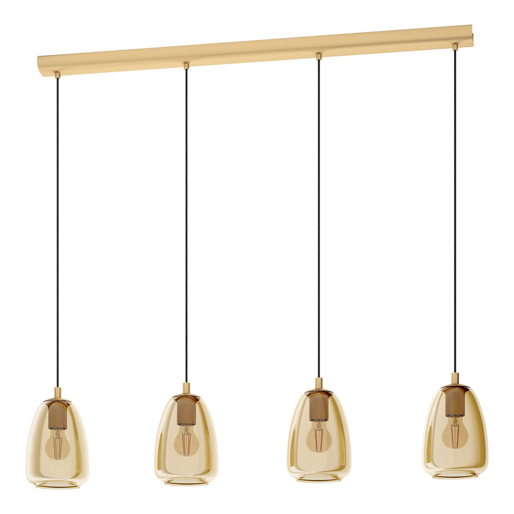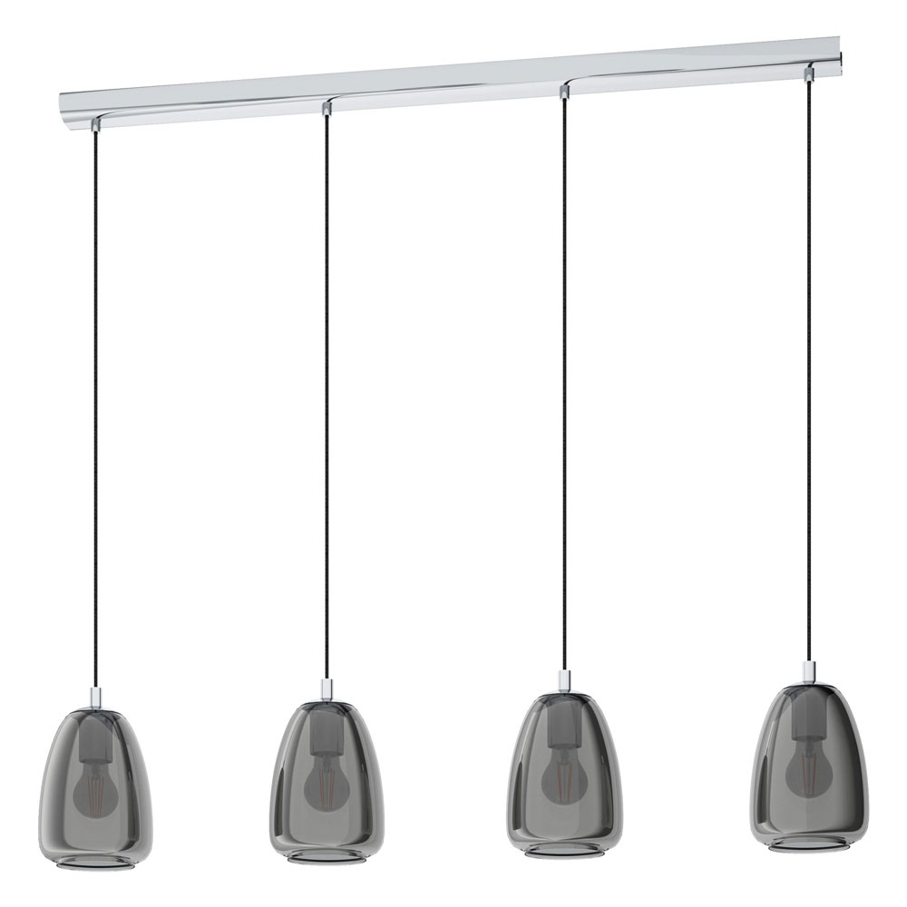Елегантен пендел с продълговата основа от стомана и четири тела от опушено стъкло тип лале, Eglo, серия Alobrase.