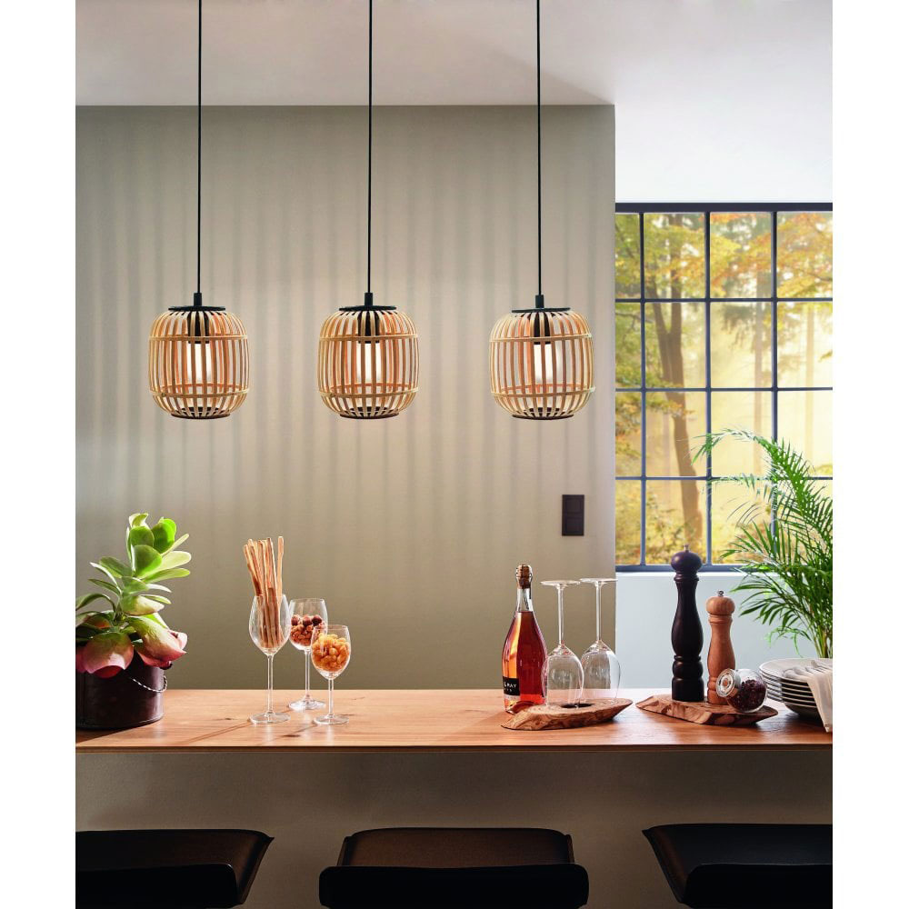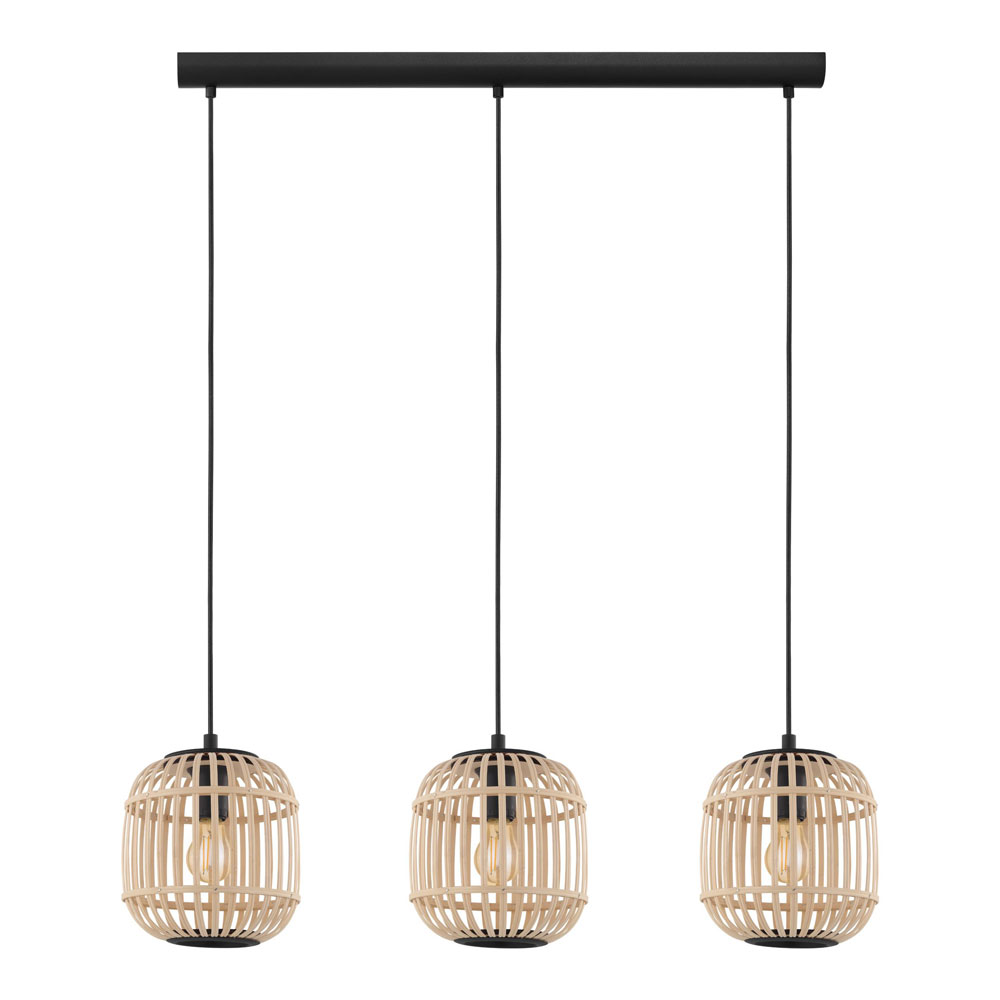 Пендел, изработен от черна стомана с три дървени решетъчни абажура в натурален цвят, Eglo, серия Bordesley.