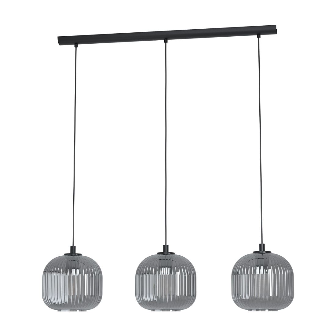 Пендел в черен цвят, изработен от стомана с три затъмнени стъклени тела с релефни форми Eglo, серия Mantunalle.