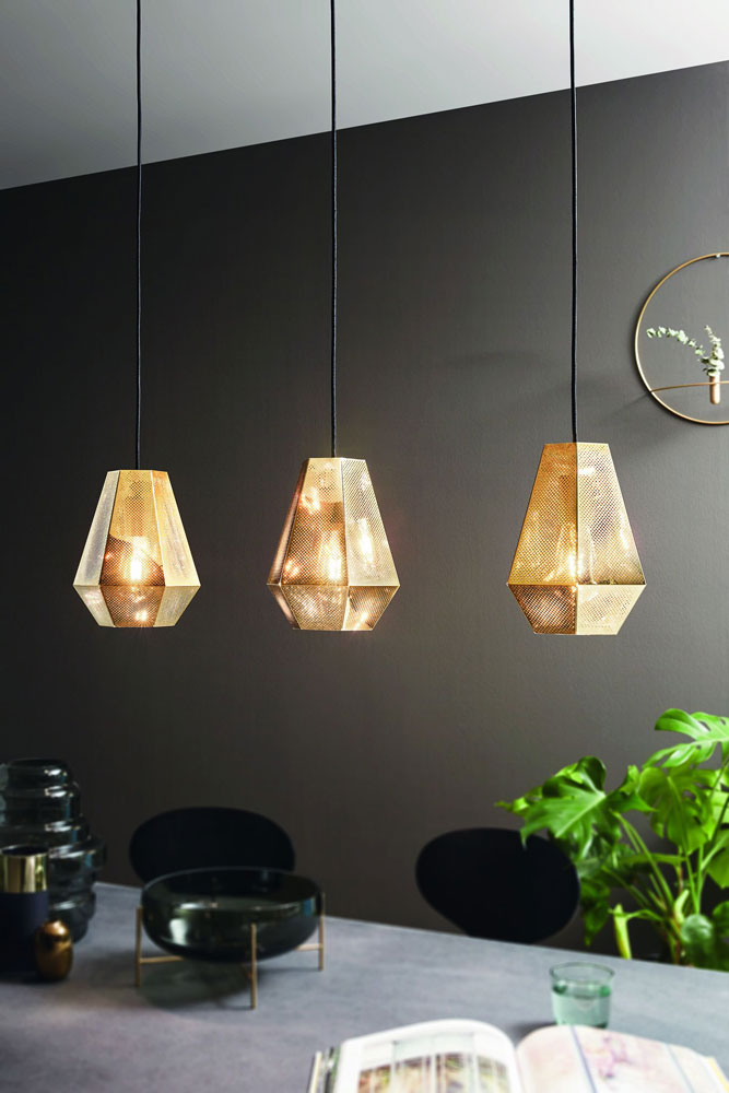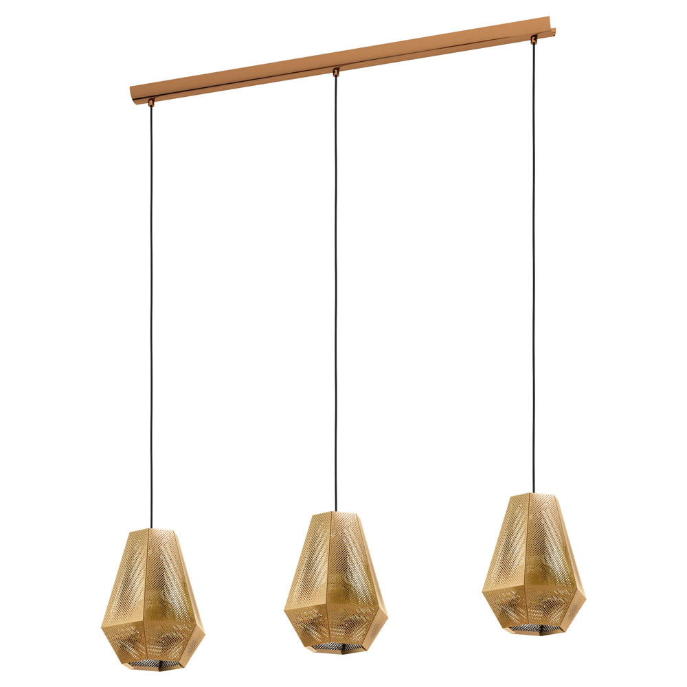 Модерен пендел с три тела с геометрична решетъчна форма, изработен от стомана в цвят месинг Eglo, серия Chiavica.