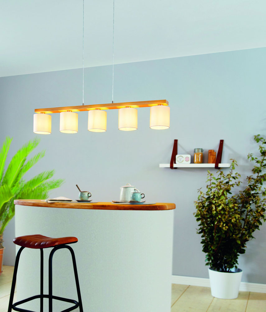 Пендел, изработен от дърво с продълговата форма, елементи от стомана в цвят никел мат и пет цилиндрични тела, Eglo, серия Castralvo.