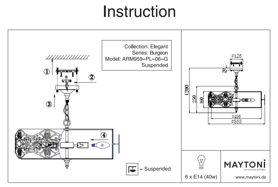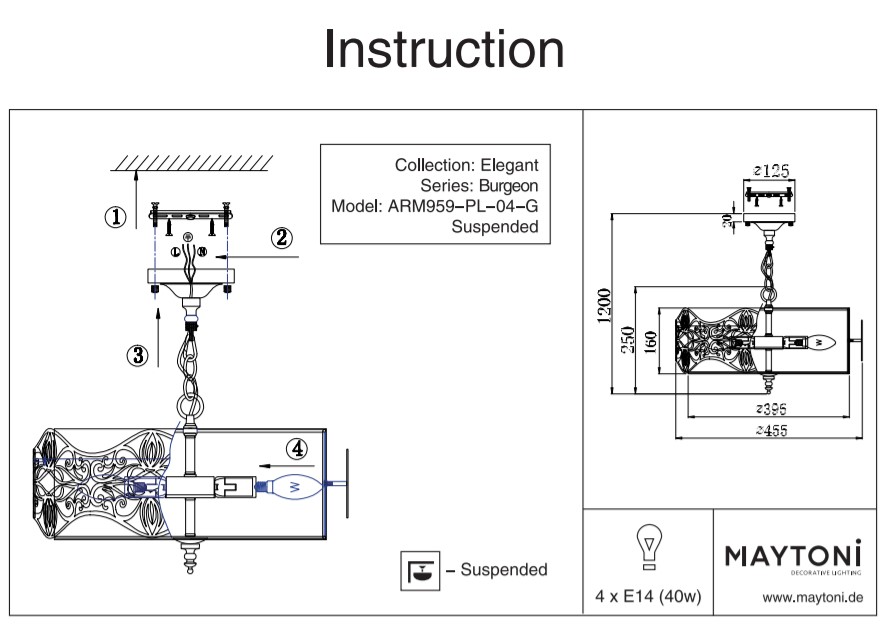 Вариант 2: шапка – ∅ 55 х 49,5 см, основа – ∅ 10 х 2,5 см, височина – 32-120 см, дължина верига – 93 см - Мощност: 4 или 6 х 40W