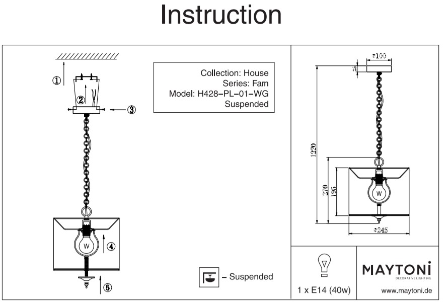 Вариант 2: шапка – ∅ 40 х 40 см, основа – ∅ 10 х 2,5 см, височина – 33-121 см, дължина верига – 95 см - Мощност: 1 или 3 х 40W