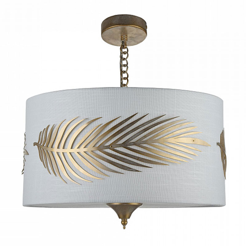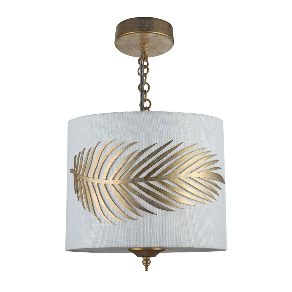 Пендел, изработен от метал с декорация папрат в златисто и бяла PVC шапка, покрита с текстил в овална форма Maytoni, серия Farn.