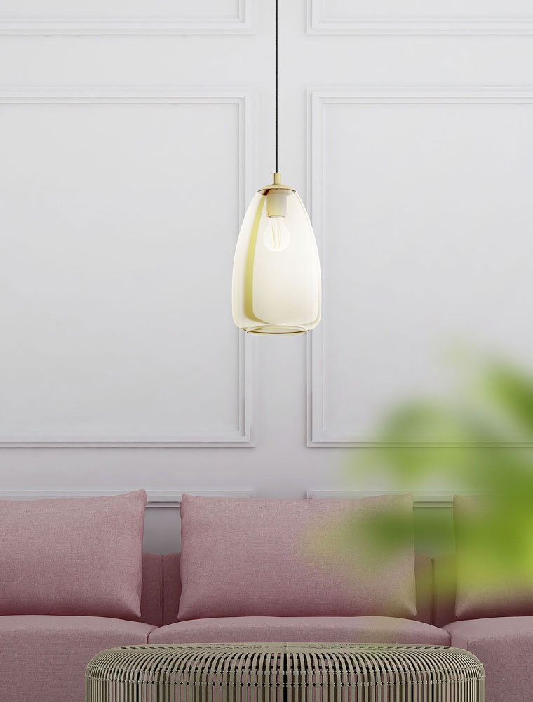 Елегантен пендел, изработен от стомана в цвят месинг с тяло от опушено стъкло в цвят кехлибар, Eglo, серия Alobrase.