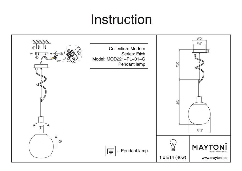 - Размери: стъклено тяло – ∅ 15 см, височина – 34,5-180,5 см, основа – ∅ 8 х 2 см, дължина на кабела – 148 см