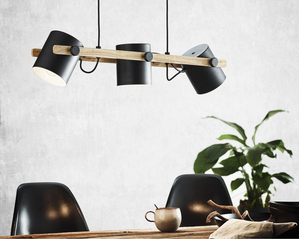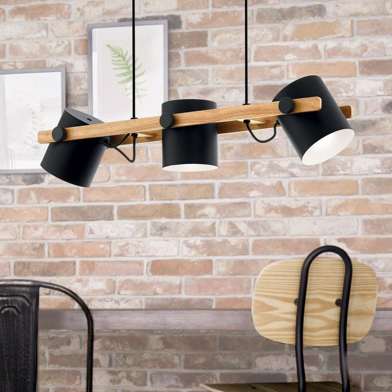 Стилен пендел с три тела в индустриален стил и в цветова комбинация черно и естествено дърво, Eglo серия Hornwood.