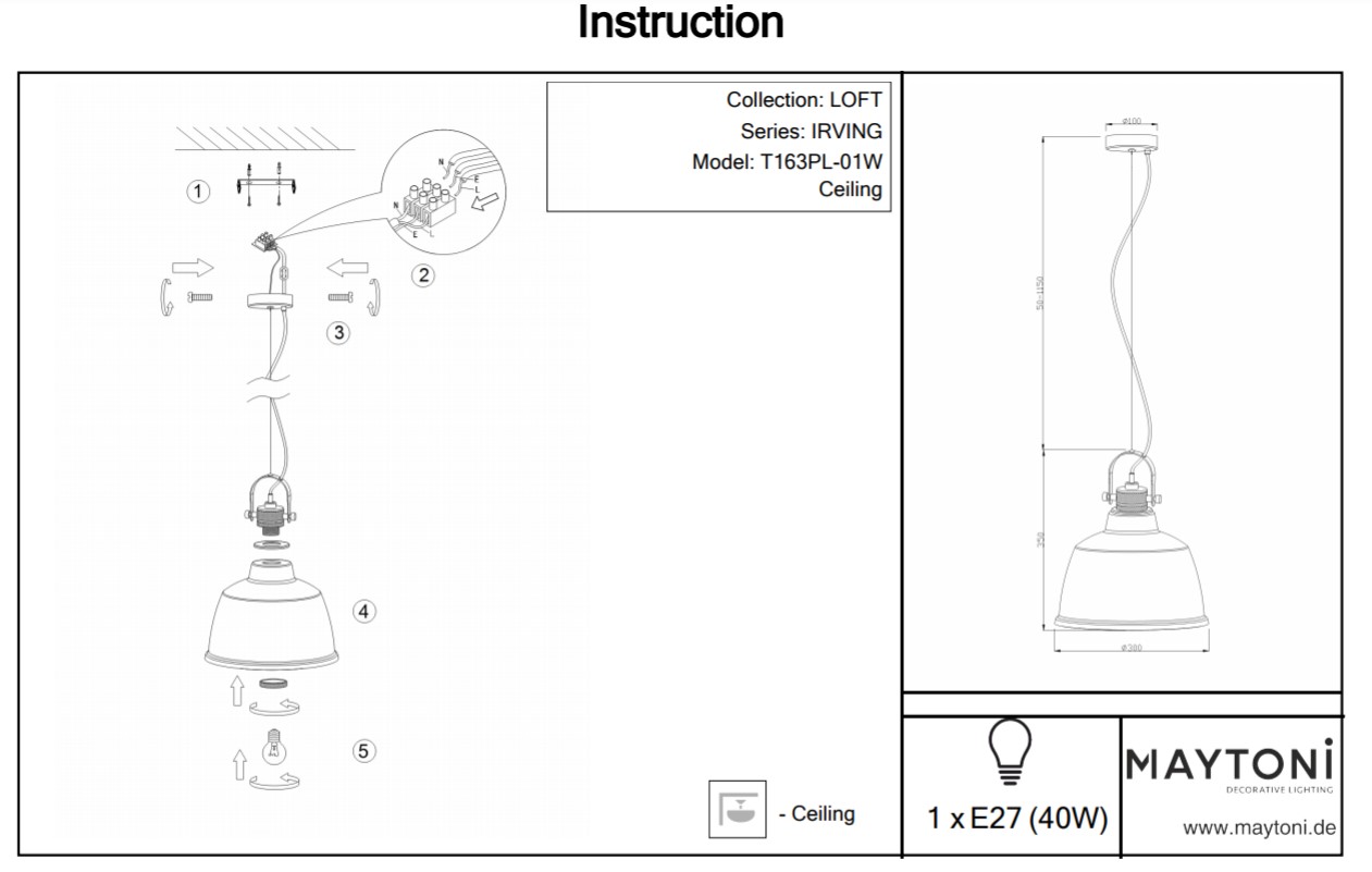 Вариант 2: диаметър – 30 см, височина – 41-150 см, основа – ∅ 10 х 2,5 см, дължина на кабела – 112,5 см - Мощност: 1 х 40W