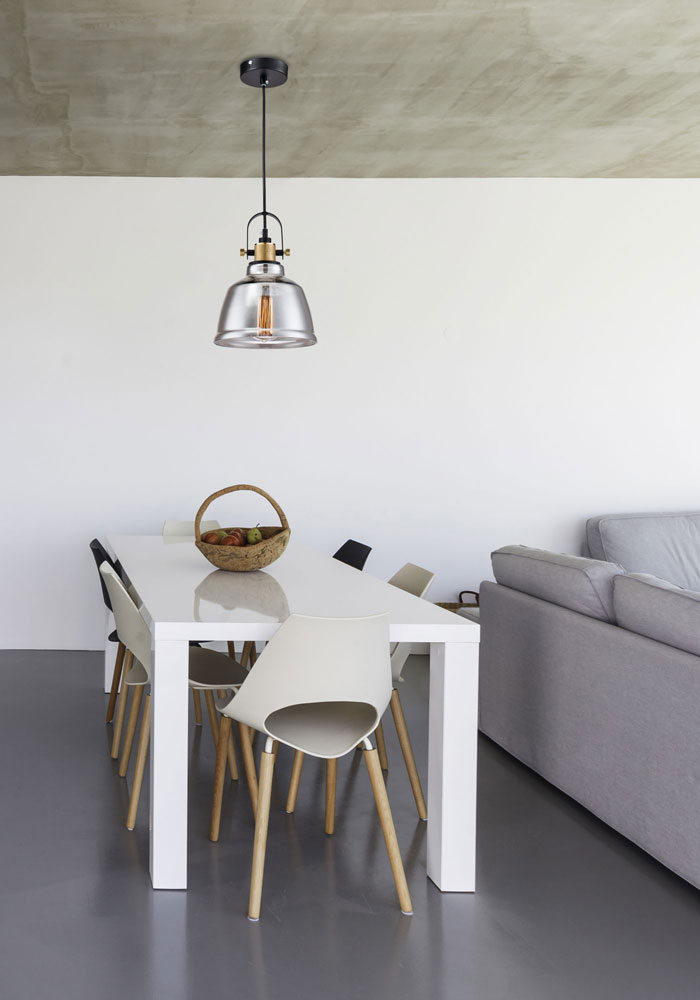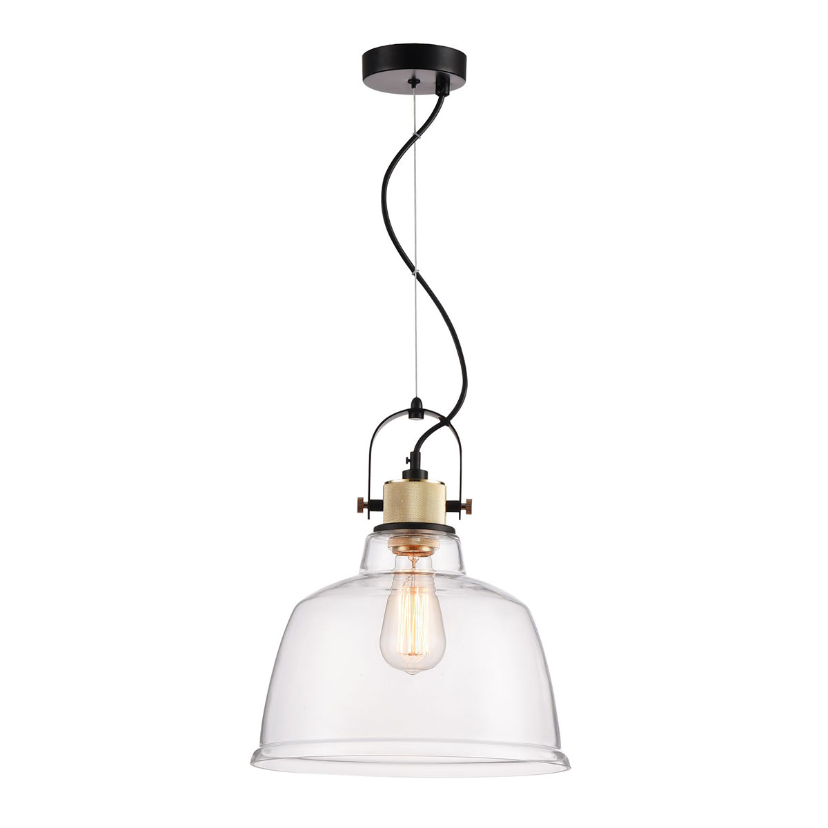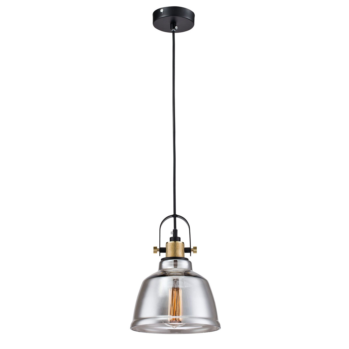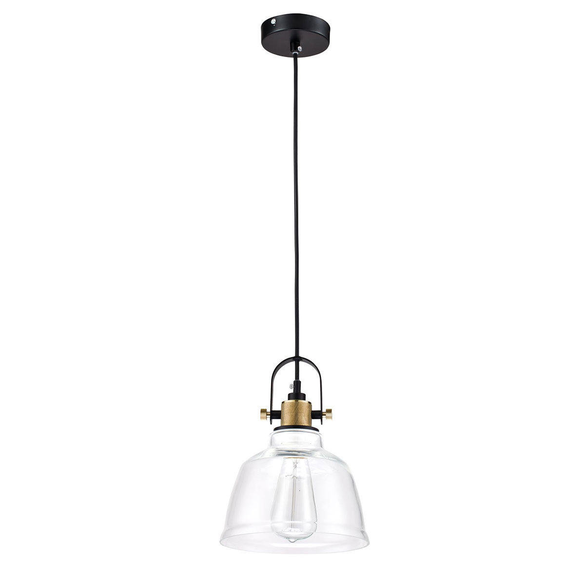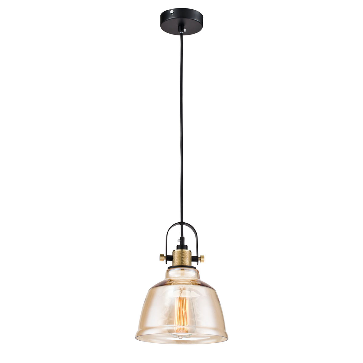 Пендел с кръгла метална основа, стъклено тяло и детайли в цвят месинг в индустриален стил Maytoni, серия Irving.